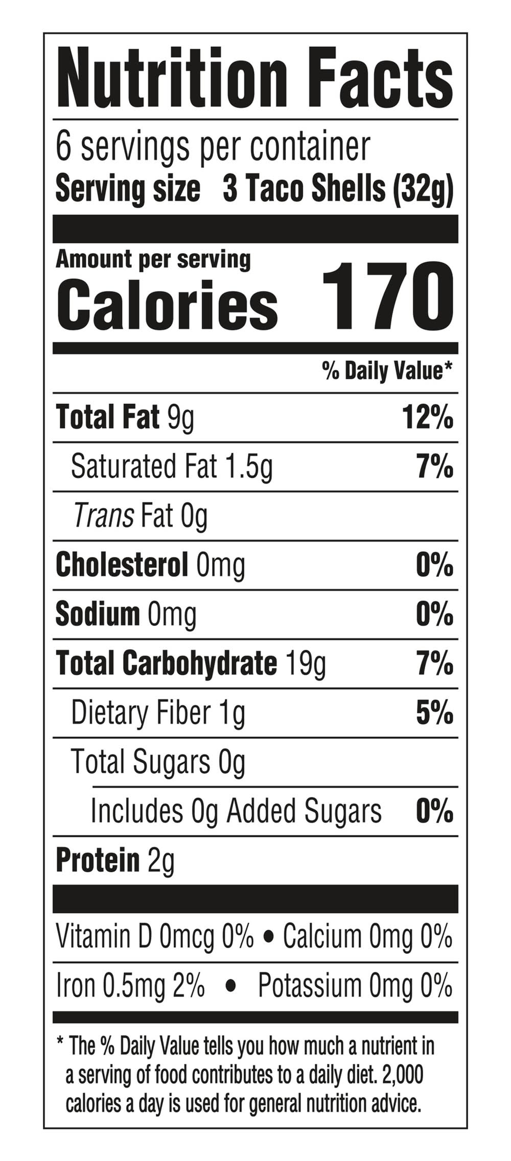 TACO SHELLS (YELLOW CORN FLOUR, CANOLA OIL, WATER), . Contains: Corn, Soybeans