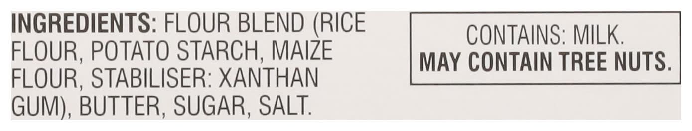 Ingredients: Flour Blend (Rice Flour, Potato Starch, Maize Flour, Stabiliser: Xanthan Gum), Butter, Sugar, Salt Contains: Milk, Tree Nuts
