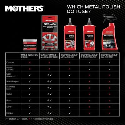 This is MOTHERS legendary metal polish. This secret formula balances a brilliant shine with ease-of-use for aluminum wheels and automotive trim and accessories, including stainless steel, brass and other alloys. Application is just a matter of a clean cloth and a little elbow grease. Mag and Aluminum Polish is strong enough to put a shine to the most neglected automotive metals and gentle enough to use on a regular basis.