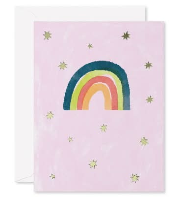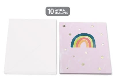 Fill your communications with vibrant color and a touch of sparkle with these blank note cards featuring a delightful watercolor rainbow and gold star accents on a soothing pastel pink background. Perfect for any occasion from hello to thank you, these cards provide a beautiful canvas for your personal messages. The set includes 10 blank cards and envelopes, offering you a charming way to express your thoughts, celebrate achievements, or just reach out to friends and family.