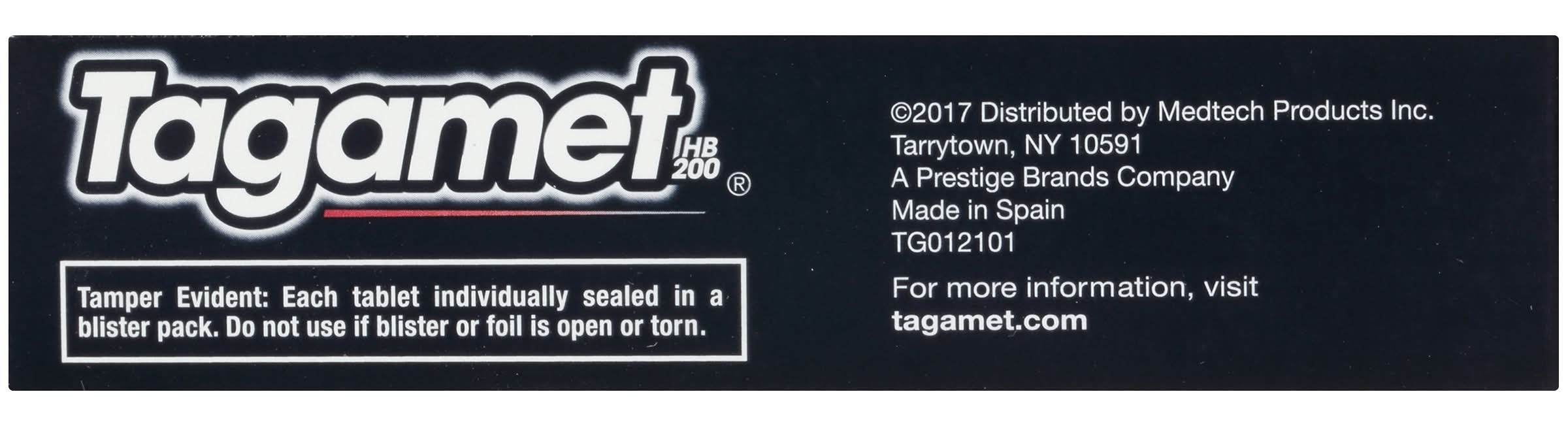 Other Information: Store at 59-86 degrees F (15-30 degrees C). Misc: 30 doses. Cimetidine tablets 200 mg/Acid reducer. Just one tablet relieves and prevents heartburn and acid indigestion. Take anytime you need it: before meal; during meal;after meal. A Prestige brands company. For more information, visit tagamet.com. Made in Spain. Medtech Products, Tarrytown, NY 10591