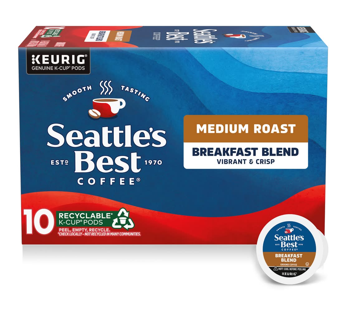 Seattle's Best Coffee Breakfast Medium Roast K-Cup pods are designed to work with all Keurig K-Cup brewers. Established in 1970, the brand offers a vibrant and crisp coffee experience with smooth citrus notes, providing a hint of brightness to any morning. The beans are selected for their quality and undergo a smooth-roasting process, contributing to the signature taste that the coffee is known for. The packaging contains 10 pods and is made with at least 35% post-consumer materials. • Size: 10 CT • Seattle's Best Coffee LLC., 2401 Utah Avenue South, Seattle, WA, 98134 • Packaging: Reusable