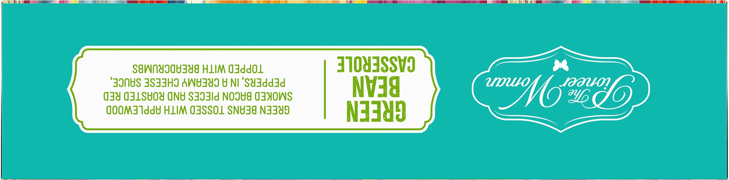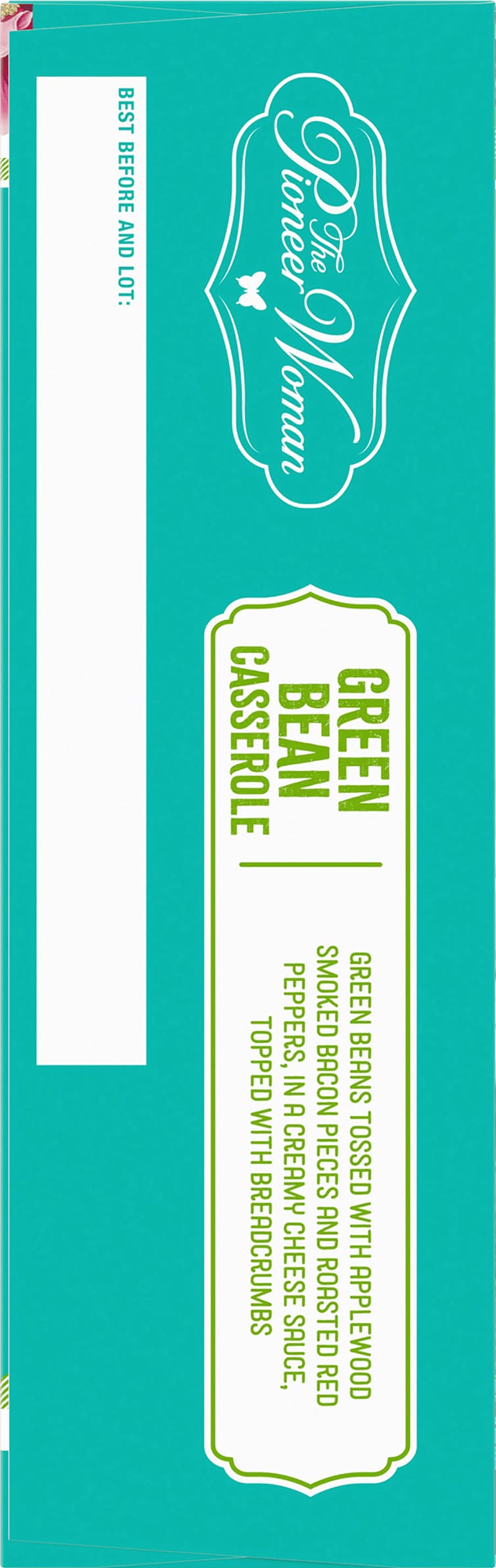 Green Beans tossed with applewood smoked bacon pieces and roasted red peppers, in a creamy cheese sauce, topped with breadcrumbs. From my Home to Yours: There’s green bean casserole, and then there’s green bean casserole! This one’s a delicious twist on the dinnertime classic, with bacon, bell peppers, cheddar cheese and delightfully crisp crumbs. You'll never look at green bean casserole the same way again! It's a total winner. Question? Comments? 888-496-0017. Please recycle this carton. Green bean fans who love bacon unite! Here's a delectable side dish from the kitchen of Ree Drummond—a Food Network celebrity who writes a successful blog called The Pioneer Woman. She has poured her fondness for exotic comfort food into this Pioneer Woman Green Bean Casserole, an addicting medley of snappy green beans tossed with Applewood smoked bacon pieces and roasted red peppers in a creamy cheese sauce, topped with breadcrumbs. No need for a casserole dish: prepares effortlessly on an included tray in either the microwave or oven. Transform any meal into a satisfying and festive dinner.
