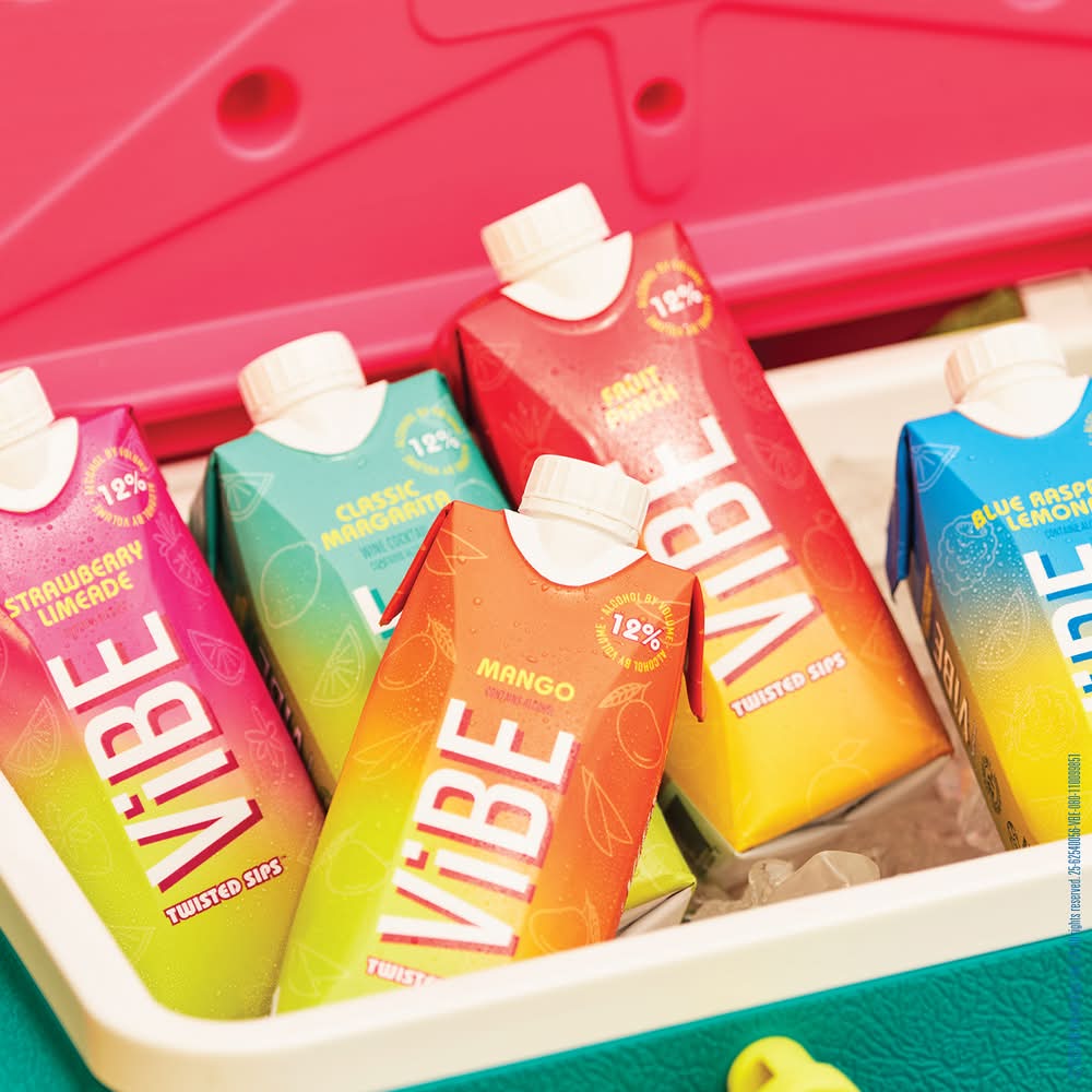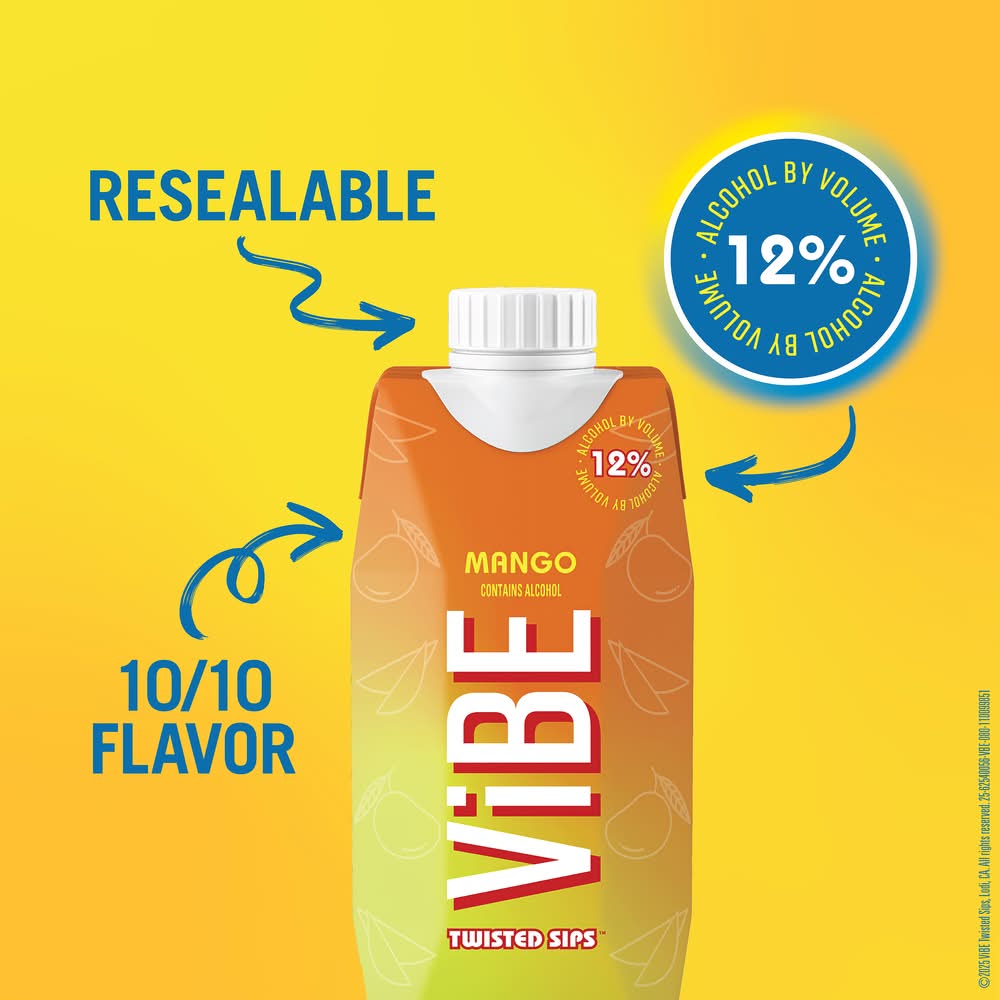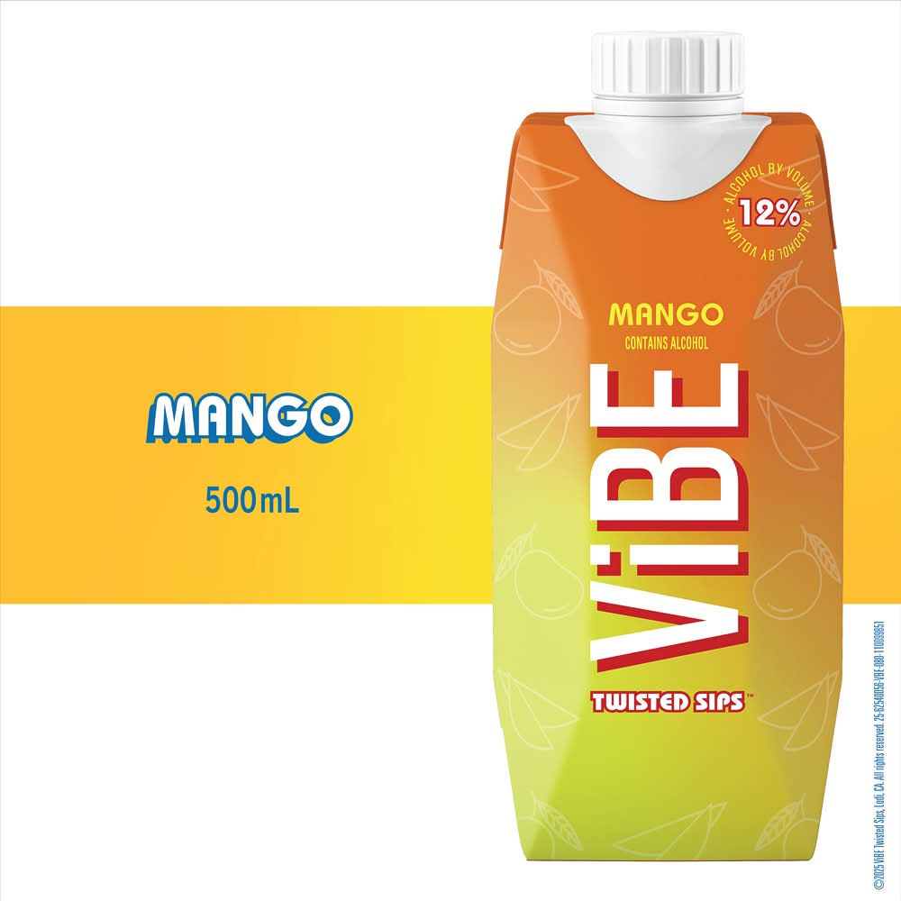 The tropics are calling. Bursting with mouthwatering mango flavor, Vibe Mango comes in a convenient 500-mL Tetra Pak that's perfect for vibing on the go. One package has three 5.7-oz wine cocktails that taste best when served chilled or over ice. The package keeps your drink tasting fresh and flavorful, and has 60% less carbon footprint than the same size in-glass. Alcohol 12% by volume.' Winemaker's notes Alcohol by volume: 12%