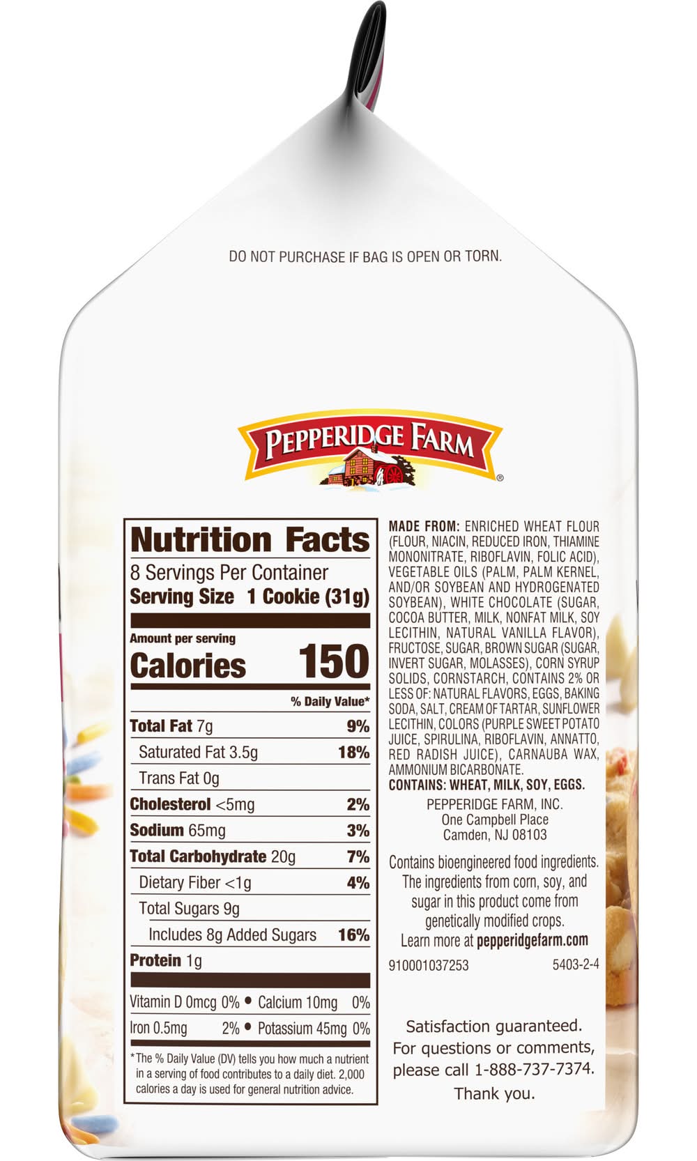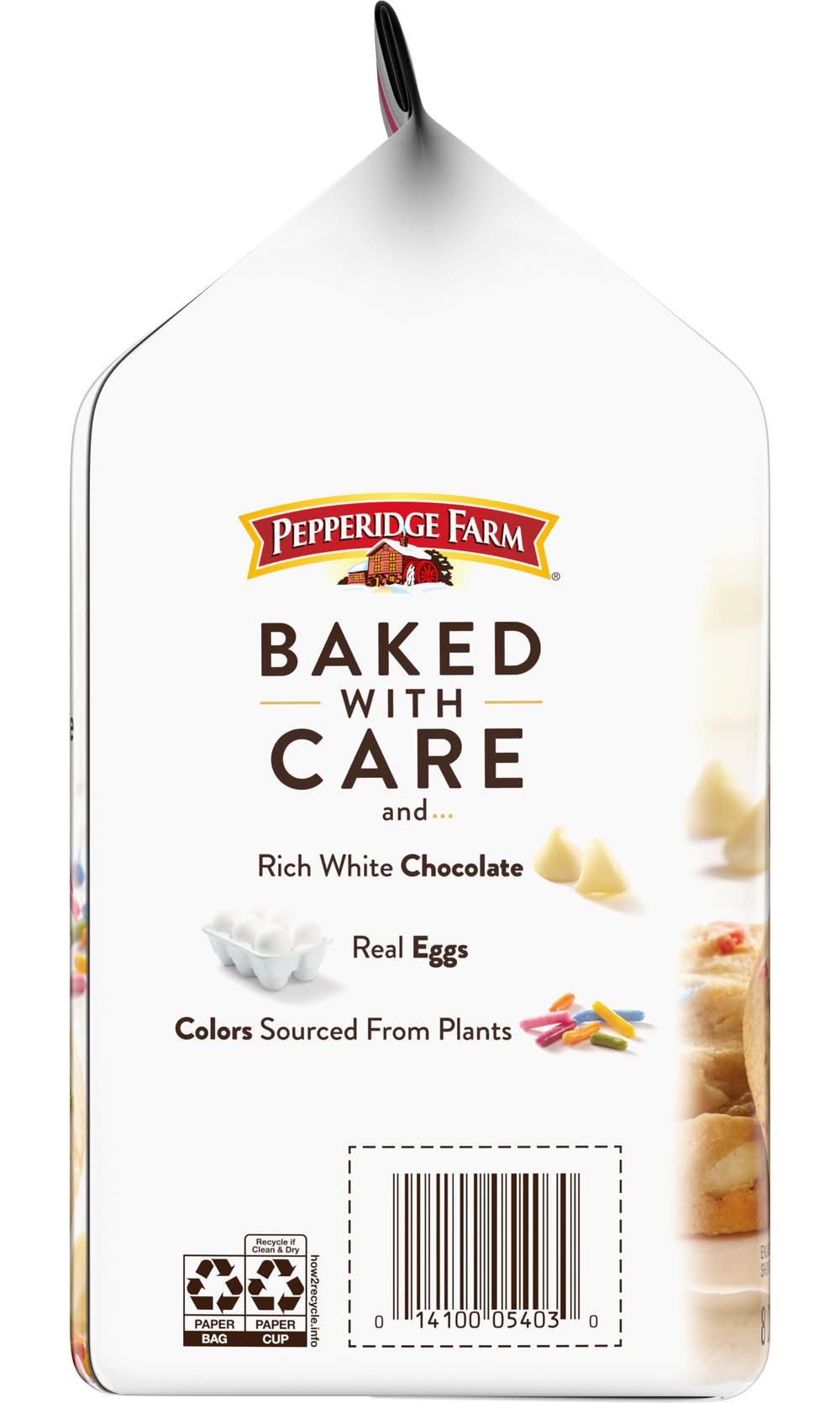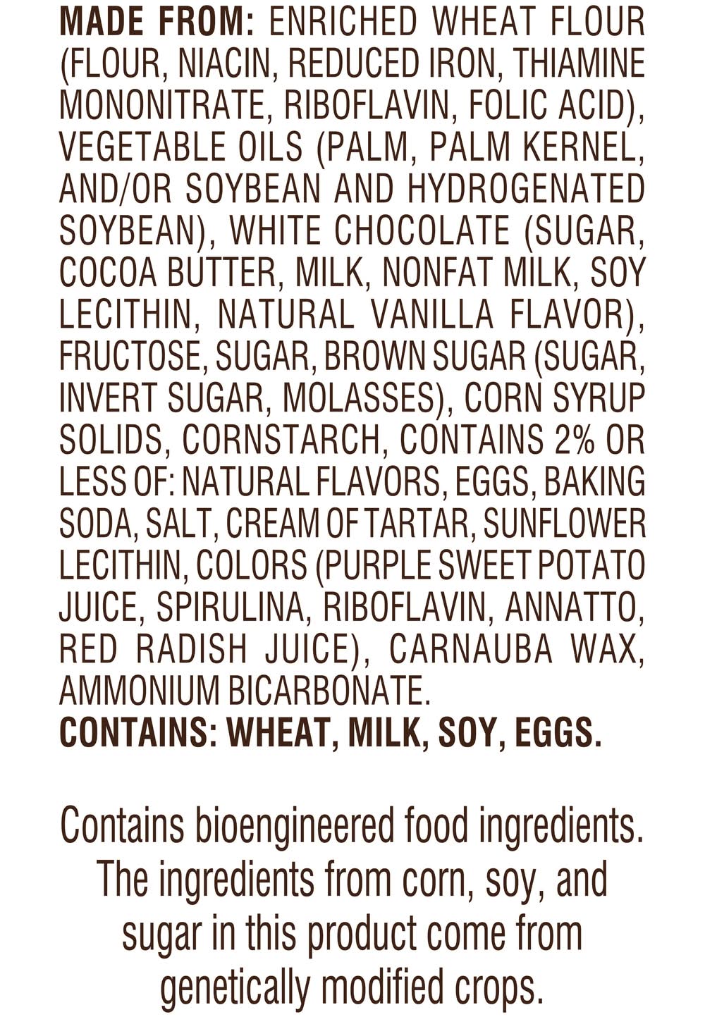 Ingredients: MADE FROM: ENRICHED WHEAT FLOUR (FLOUR, NIACIN, REDUCED IRON, THIAMINE MONONITRATE, RIBOFLAVIN, FOLIC ACID), VEGETABLE OILS (PALM, PALM KERNEL, AND/OR SOYBEAN AND HYDROGENATED SOYBEAN), WHITE CHOCOLATE (SUGAR, COCOA BUTTER, MILK, NONFAT MILK, SOY LECITHIN, NATURAL VANILLA FLAVOR), FRUCTOSE, SUGAR, BROWN SUGAR (SUGAR, INVERT SUGAR, MOLASSES), CORN SYRUP SOLIDS, CORNSTARCH, CONTAINS 2% OR LESS OF: NATURAL FLAVORS, EGGS, BAKING SODA, SALT, CREAM OF TARTAR, SUNFLOWER LECITHIN, COLORS (PURPLE SWEET POTATO JUICE, SPIRULINA, RIBOFLAVIN, ANNATTO, RED RADISH JUICE), CARNAUBA WAX, AMMONIUM BICARBONATE. CONTAINS: WHEAT, MILK, SOY, EGGS. Contains: CONTAINS: Egg, Gluten, Milk/Dairy, Soybean, Wheat