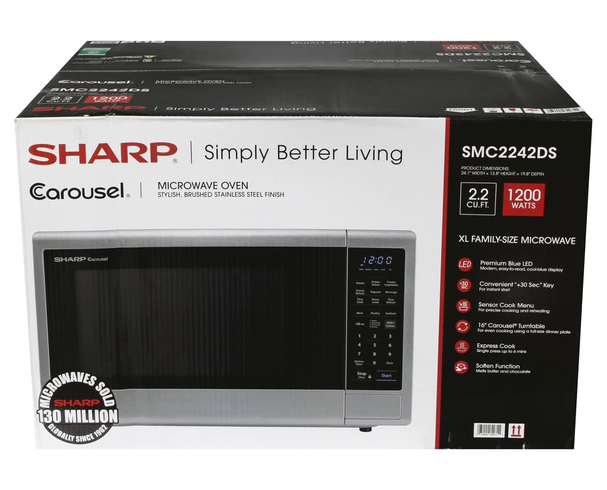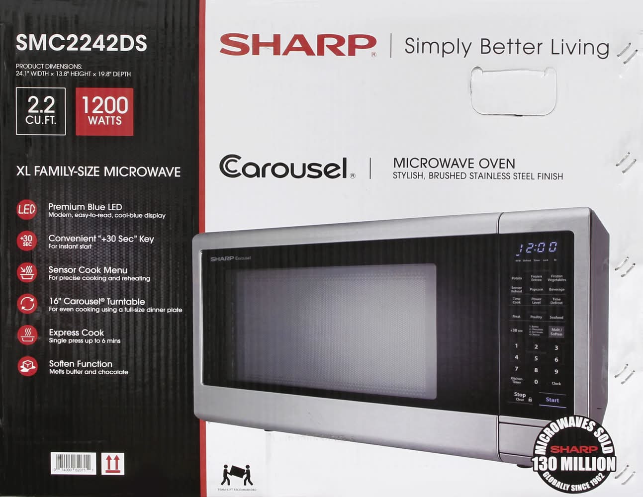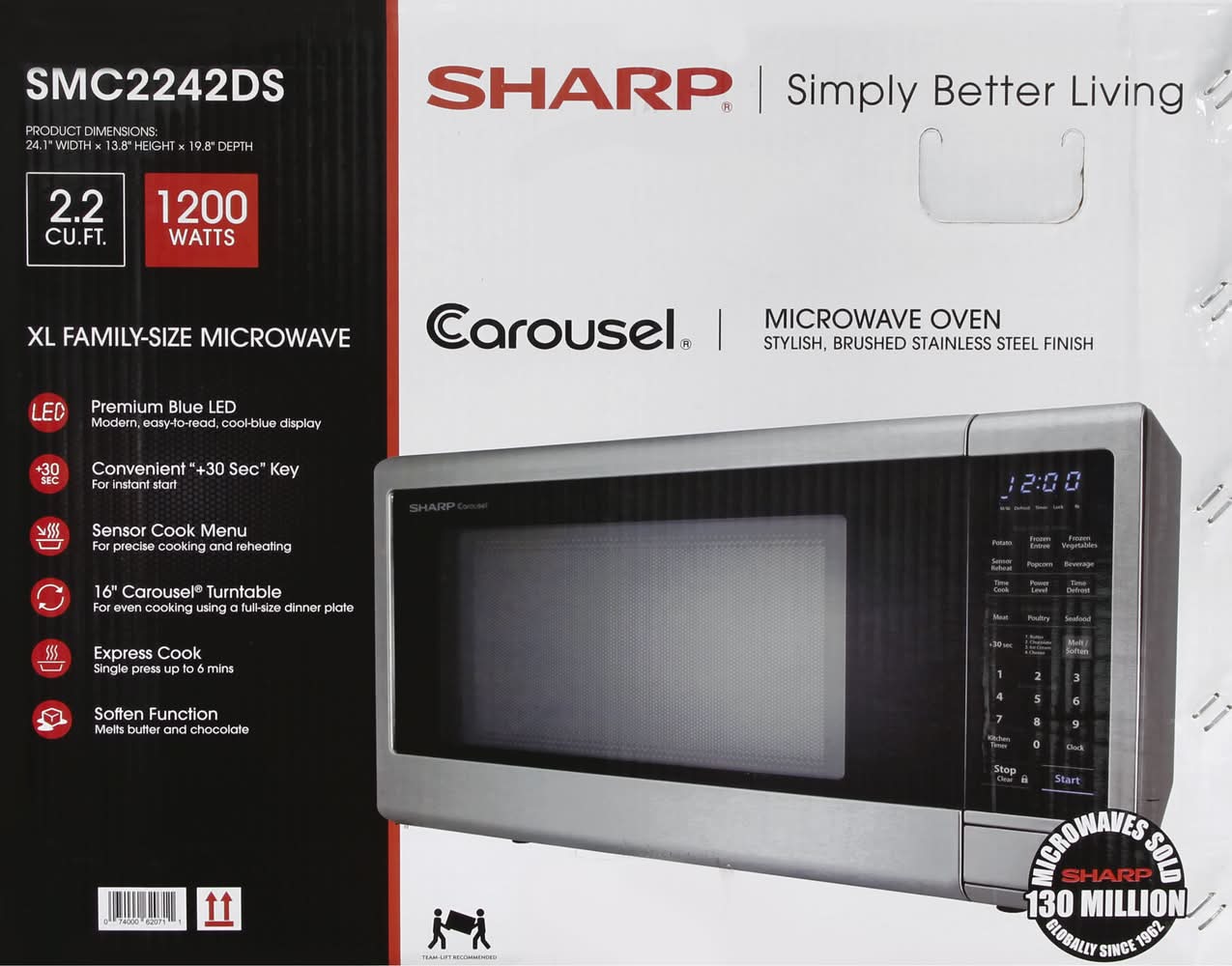 Simply better living. Stylish, brushed stainless steel finish. Microwaves sold. Sharp 130 million. Globally since 1962. Product dimensions: 24.1 inches width x 13.8 inches height x 19.8 inches depth. 2.2 Cu.Ft. 1200 Watts. LED: Premium blue LED: Modern, easy-to-read, cool-blue display. Convenient +30 sec key: For instant start. Sensor Cook Menu: For precise cooking and reheating. 16 Inches Carousel Turntable: For even cooking using a full-size dinner plate. Express Cook: Single press up to 6 mins. Soften Function: Melts butter and chocolate. Team-lift recommended. Internal capacity is calculated by measuring maximum width, depth and height. Actual capacity for holding food is loss. UL Listed. Single phase 120V, 60Hz, AC only FCC Authorized Complies with DHHS rules. www.sharpusa.com. Intertek For further information see www.intertek.com/green/certification. RoHS Cert No. 1817051. Made in China. Sharp Electronics.,