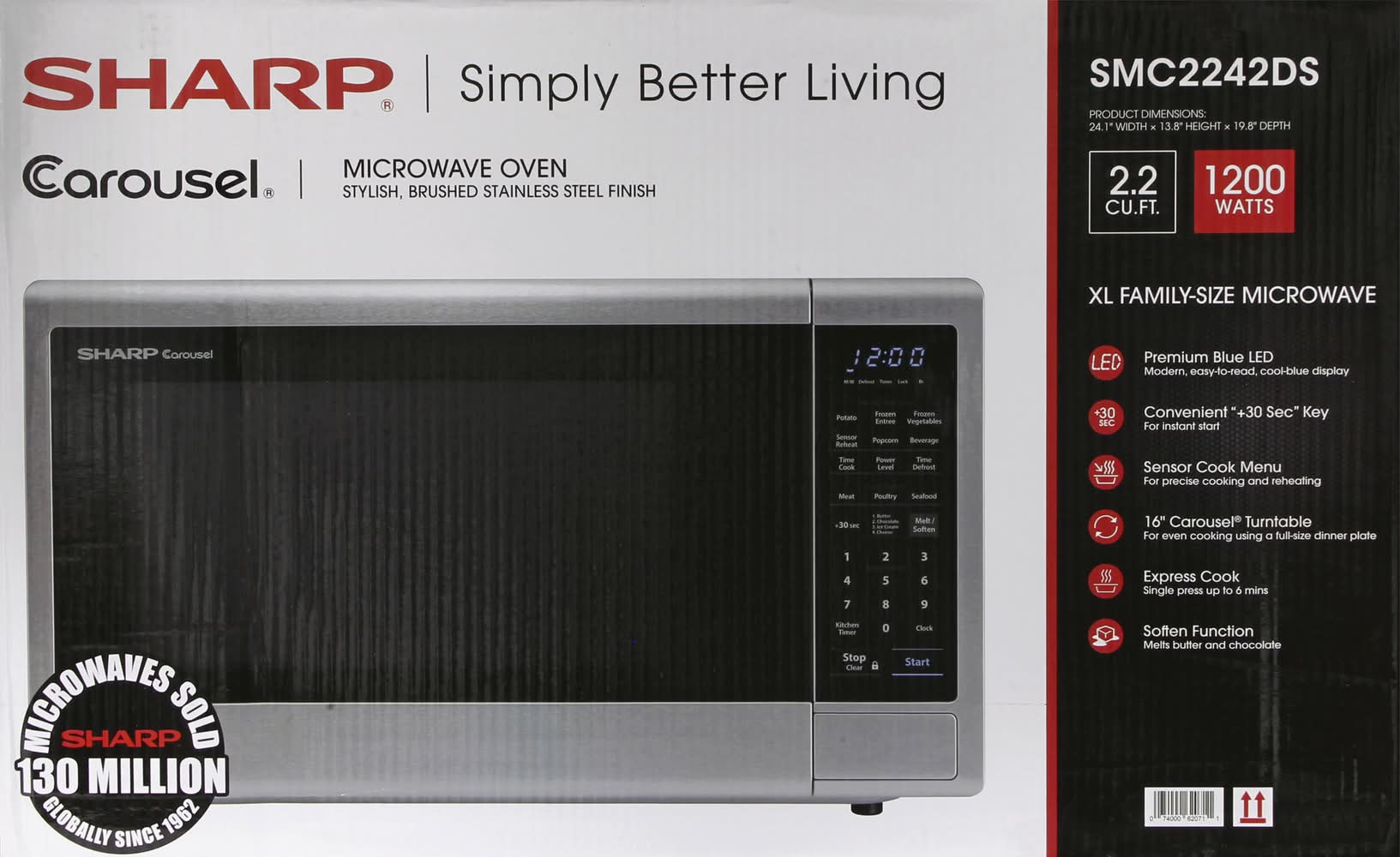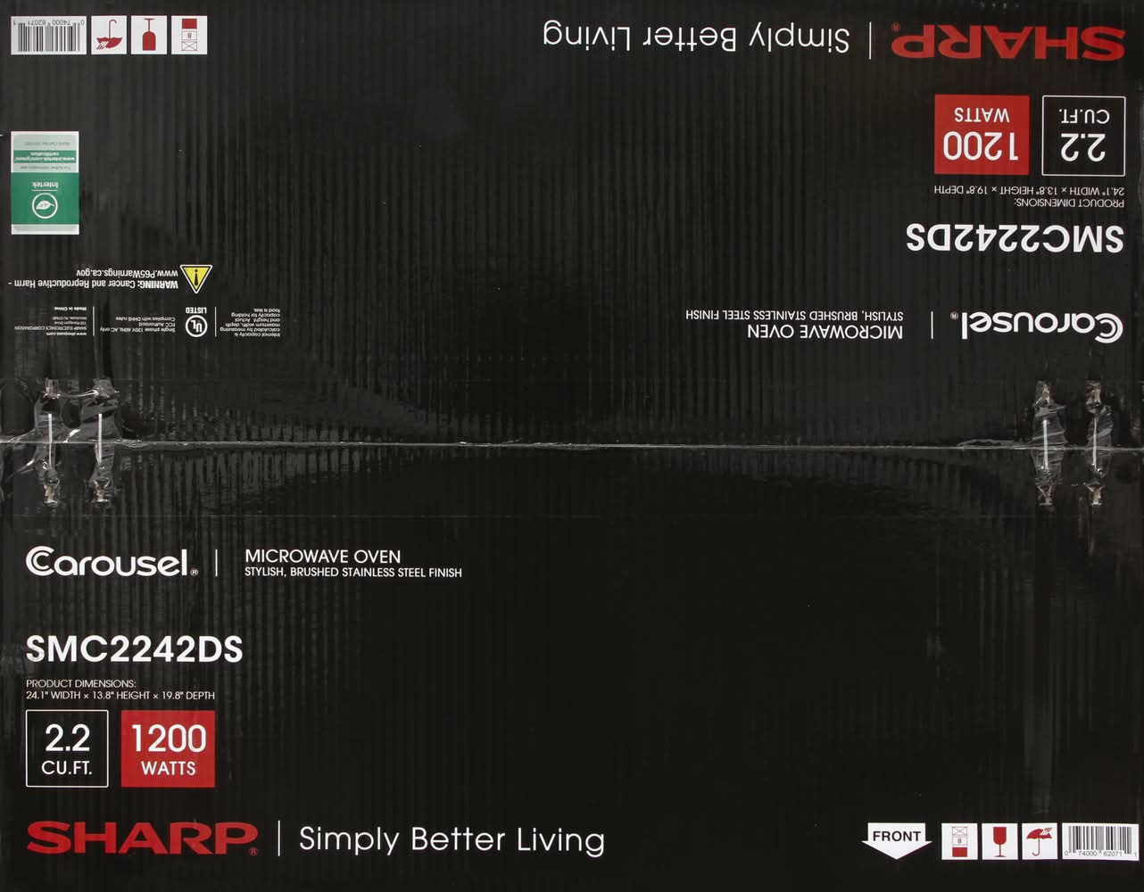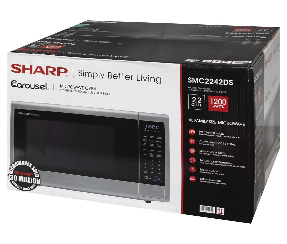 Simply better living. Stylish, brushed stainless steel finish. Microwaves sold. Sharp 130 million. Globally since 1962. Product dimensions: 24.1 inches width x 13.8 inches height x 19.8 inches depth. 2.2 Cu.Ft. 1200 Watts. LED: Premium blue LED: Modern, easy-to-read, cool-blue display. Convenient +30 sec key: For instant start. Sensor Cook Menu: For precise cooking and reheating. 16 Inches Carousel Turntable: For even cooking using a full-size dinner plate. Express Cook: Single press up to 6 mins. Soften Function: Melts butter and chocolate. Team-lift recommended. Internal capacity is calculated by measuring maximum width, depth and height. Actual capacity for holding food is loss. UL Listed. Single phase 120V, 60Hz, AC only FCC Authorized Complies with DHHS rules. www.sharpusa.com. Intertek For further information see www.intertek.com/green/certification. RoHS Cert No. 1817051. Made in China. Sharp Electronics.,