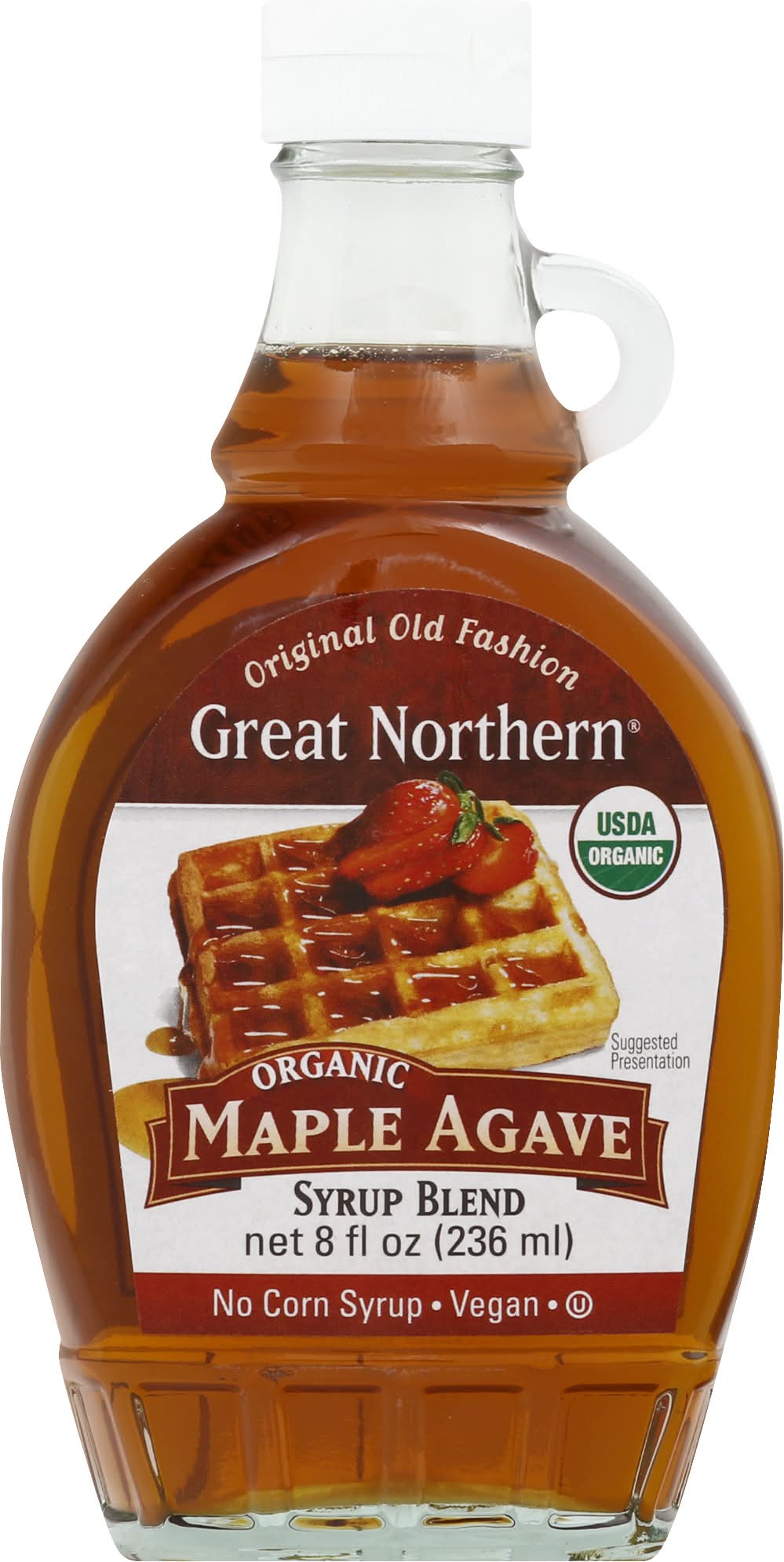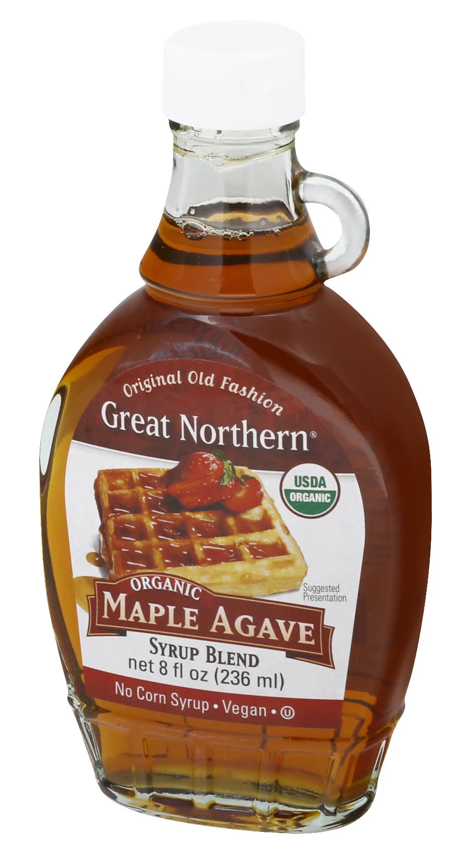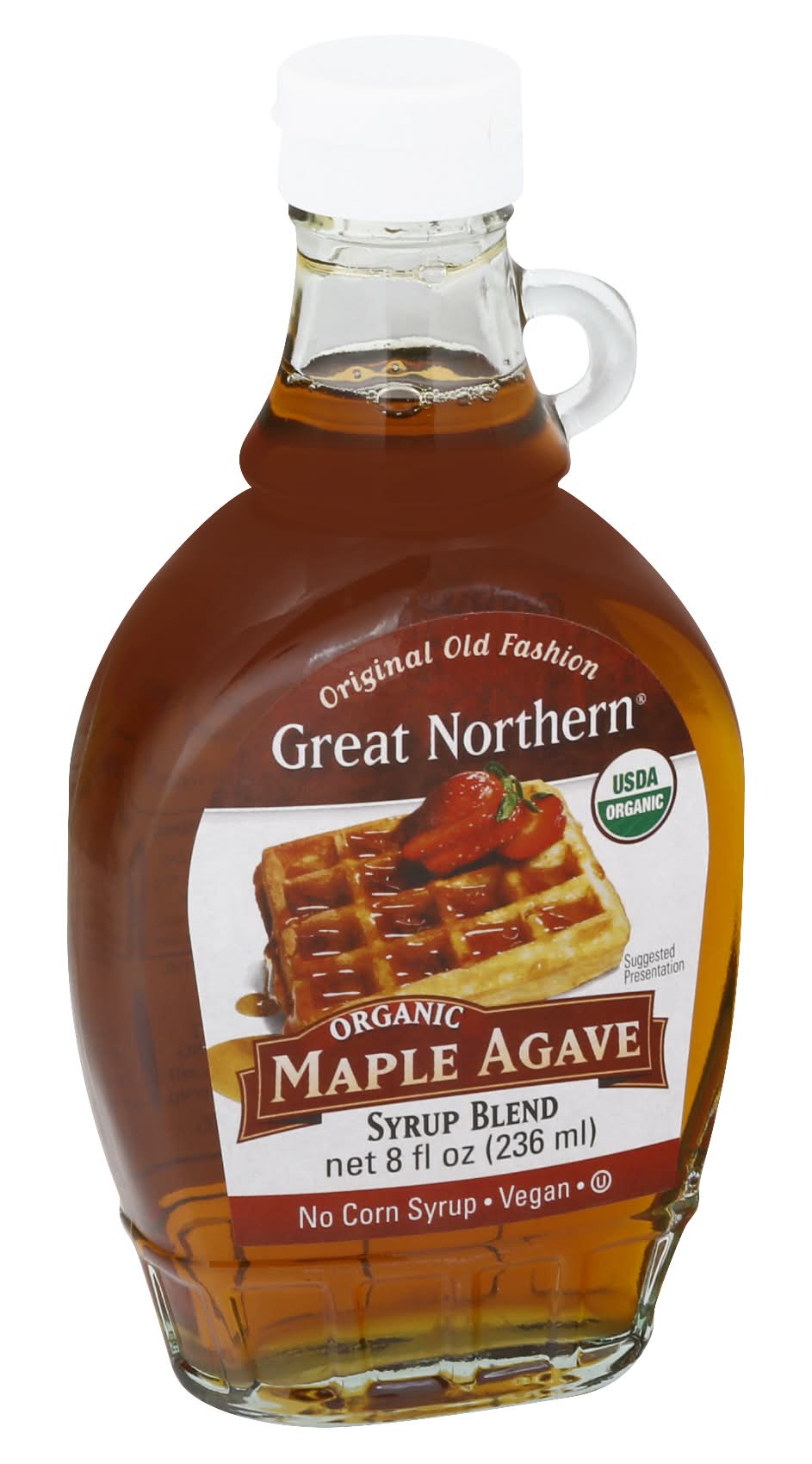 USDA Organic. Certified by Ecocert Canada. Vegan. No corn syrup. Original Old Fashion. Combining the great taste of pure maple syrup with the low glycemic index of agave, our organic maple agave syrup is great on pancakes, ice cream, waffles, yogurt, iced tea, fresh fruits. www.greatnorthernmaple.com. GREAT NORTHERN MAPLE PRODUCTS,