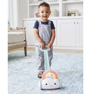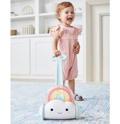 Designed to foster the development of gross motor skills, the Skip Hop Silver Lining Cloud Rainbow Push Toy aids in building walking confidence and balance. It features a popping mechanism and is styled with a vibrant rainbow theme, making it an engaging push toy for young users.