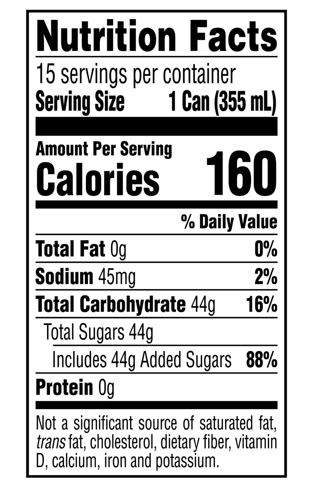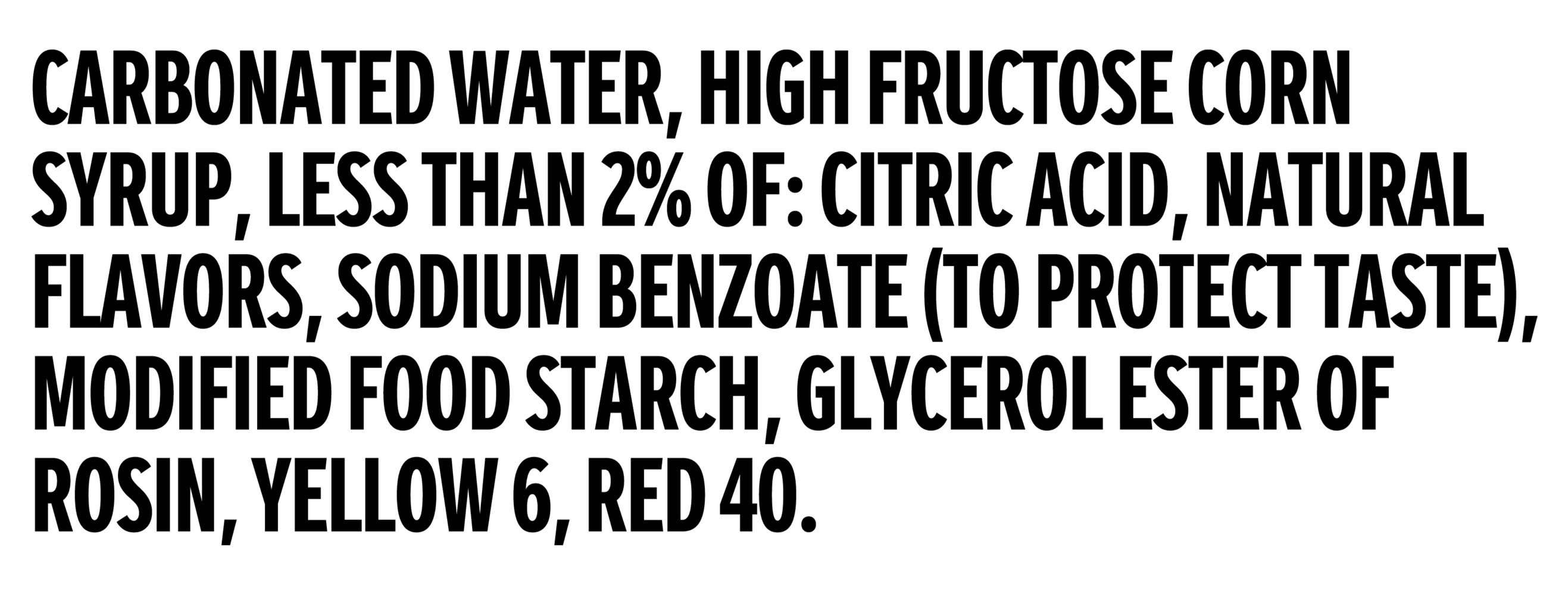 Ingredients: Carbonated Water, High Fructose Corn Syrup, Citric Acid, Sodium Benzoate (To Protect Taste), Natural Flavors, Modified Food Starch, Sodium Polyphosphates, Glycerol Ester Of Rosin, Yellow 6, Red 40.