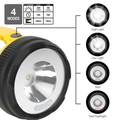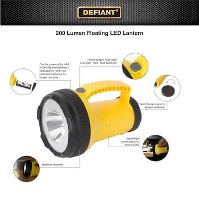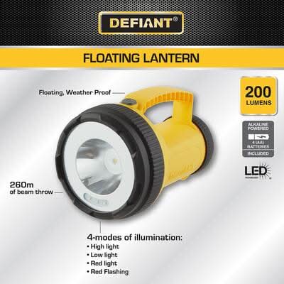 The Defiant 200-Lumens Floating LED Lantern gives you bright light when you need it, whether you're staying inside during a power outage or moving about outdoors. The Lantern floats for easy recovery in water, making this lantern ideal for storing in boats, kayaks, canoes, survival kits and more. Equipped with 200-Lumens of bright LED light, this floating light has 220meters beam distance. Includes 4 AA alkaline batteries to keep this LED camping lantern shining brightly for up to 10-hours or use 8 AA alkaline batteries for 140-hours of reliable light when you need it most. The large handle is easy to grab for a comfortable and convenient handheld lantern. There are 4 modes available: High - 200-Lumens / 18 hours run time / 260m throw; Low Light - 80-Lumens / 70 hours run time / 185m throw; Red and Red Flashing