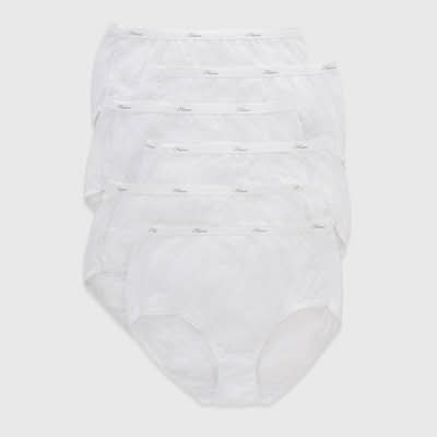 Soft and breathable, this better-than-basic cotton brief underwear is made with Hanes Cool Comfort fabric that wicks moisture from your skin to keep you comfortable all day. The classic brief silhouette features a high rise and full front and back coverage with an ultra-soft waistband. No-ride-up leg bands stay in place while Tagless construction eliminates that annoying itch. Know what's even better? These women’s briefs are available in a convenient pack of six white panties. Stock up and start experiencing the true comfort of Hanes, all day, every day. • Color: White • female