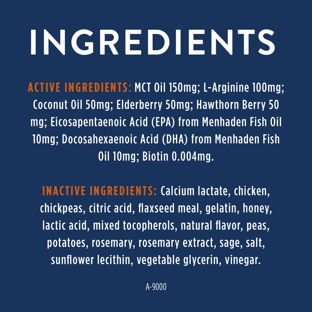 Active Ingredients: Mct Oil 150Mg; L-Arginine 100Mg; Coconut Oil 50Mg; Elderberry 50Mg; Hawthorn Berry 50 Mg; Eicosapentaenoic Acid (Epa) From Menhaden Fish Oil 10Mg; Docosahexaenoic Acid (Dha) From Menhaden Fish Oil 10Mg; Biotin 0.004Mg. Inactive Ingredients: Calcium Lactate, Chicken, Chickpeas, Citric Acid, Flaxseed Meal, Gelatin, Honey, Lactic Acid, Mixed Tocopherols, Natural Flavor, Peas, Potatoes, Rosemary, Rosemary Extract, Sage, Salt, Sunflower Lecithin, Vegetable Glycerin, Vinegar.