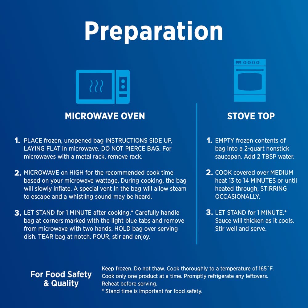 Directions for use: For food safety & quality follow these instructions carefully: Keep frozen - do not thaw. Cook thoroughly to a temperature of 165 degrees F. Cook only one product at a time. Promptly refrigerate any leftovers. Reheat before serving. Microwave Instructions: Microwave ovens vary - adjust cooking times as needed to reach 165 degrees F as measured by a food thermometer taken in several spots. 1. Place frozen unopened bag this side up, laying flat in microwave. Do not pierce bag. For microwaves with a metal rack, remove rack. 2. Microwave on high for the recommended cook time based on your microwave wattage. During cooking, the bag will slowly inflate. A special vent in the bag will allow the steam to escape and a whistling sound may be heard. 3. Let stand for 1 minute after cooking (Stand time is important for food safety). Carefully handle bag at corners marked with the light blue tabs and remove from microwave with two hands. Hold bag over serving dish. Tear bag at notch. Pour, stir and enjoy! Microwave Cook Time: 1200 watts (5 minutes). 1000 watts (5-1/2 minutes). 800 watts (6-1/2 minutes). For microwave ovens less than 800 watts, please use stovetop cooking instructions. Stove Top Instructions: 1. Empty frozen contents of bag into a 2-quart nonstick sauce pan. Add 2 tablespoons water. 2. Cook covered over medium heat for 13 to 14 minutes or until heated through, stirring occasionally. 3. Let stand for 1 minute (Stand time is important for food safety). Sauce will thicken as it colors. Stir well and serve. Keep frozen - do not thaw. Storage recommendation: Keep frozen - do not thaw.