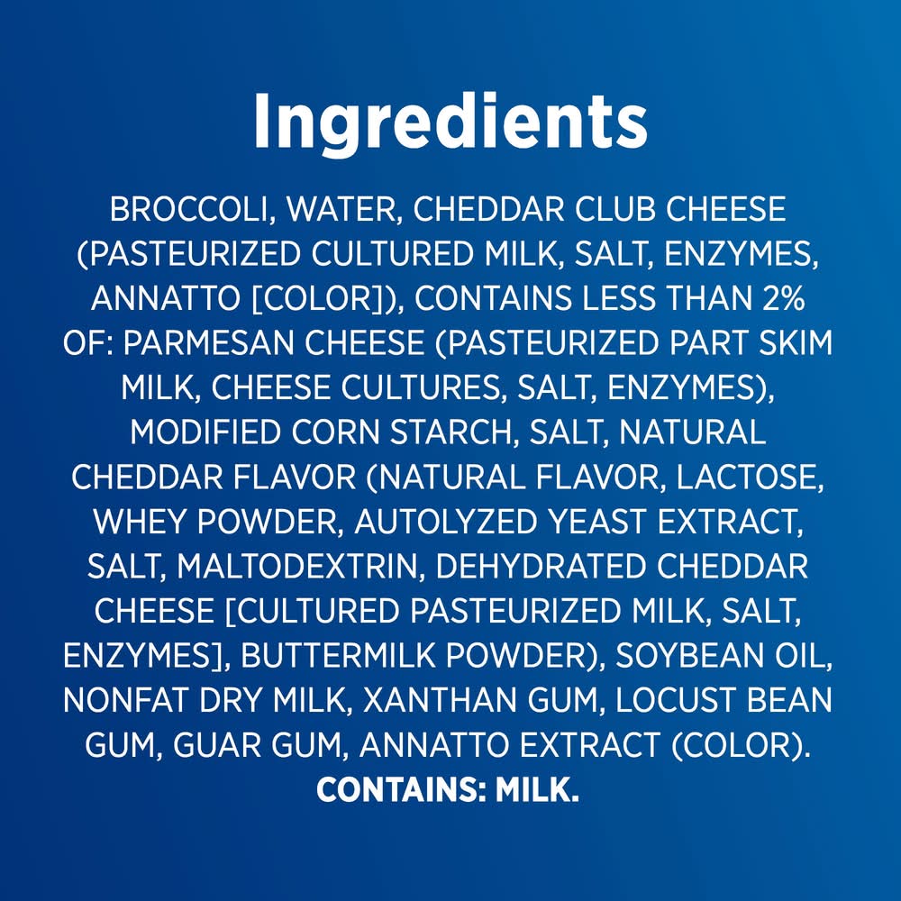 Ingredients: Broccoli, Water, Cheddar Club Cheese (Pasteurized Cultured Milk, Salt, Enzymes, Annatto [Color]), Contains Less than 2% of: Parmesan Cheese (Pasteurized Part Skim Milk, Cheese Cultures, Salt, Enzymes), Modified Corn Starch, Salt, Monosodium Glutamate, Cheddar Cheese (Pasteurized Milk, Cultures, Salt, Enzymes), Natural Cheddar Flavor (Natural Flavor, Lactose, Whey Powder, Autolyzed Yeast Extract, Salt, Maltodextrin, Dehydrated Cheddar Cheese [Cultured Pasteurized Milk, Salt, Enzymes], Buttermilk Powder), Soybean Oil, Nonfat Milk, Lactic Acid, Gum, Sodium Citrate, Annatto Extract (Color) Contains: Milk