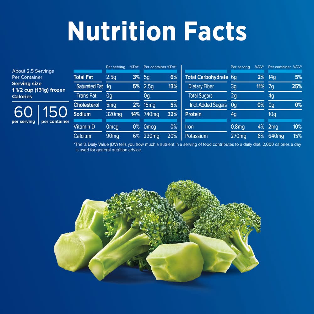 Enjoy savory vegetables without the hassle when you have Birds Eye Steamfresh Sauced Cheesy Broccoli. Broccoli sauced with cheddar cheese makes it easy for everyone to love their vegetables. This frozen broccoli was specially selected and flash frozen, locking in fresh flavor and nutrients, to provide high-quality frozen vegetables. This Birds Eye frozen vegetable dish is made with no artificial flavors or preservatives for a delicious and convenient way to enjoy vegetable dishes and frozen sides without compromise. Serve the frozen vegetable with sauce as a side dish along with your favorite grilled meat, or add them to pasta dishes or casseroles as part of a main dish. Easily prepare the frozen broccoli side dishes by microwaving them in the bag for up to 6 1/2 minutes or by cooking on the stovetop for 13 to 14 minutes. Let stand for 1 to 2 minutes before serving. Store this 10.8 ounce bag of steamable frozen veggies in the freezer to maintain freshness until you are ready to enjoy. It's good to eat vegetables, so Birds Eye makes vegetables good to eat. • Flavor: • Conagra Brands, PO Box 3534,Chicago,IL,60654