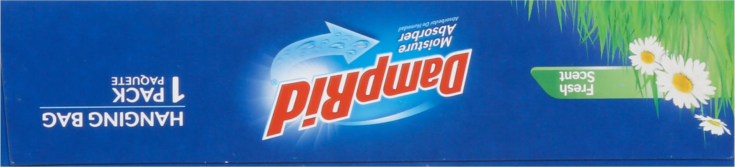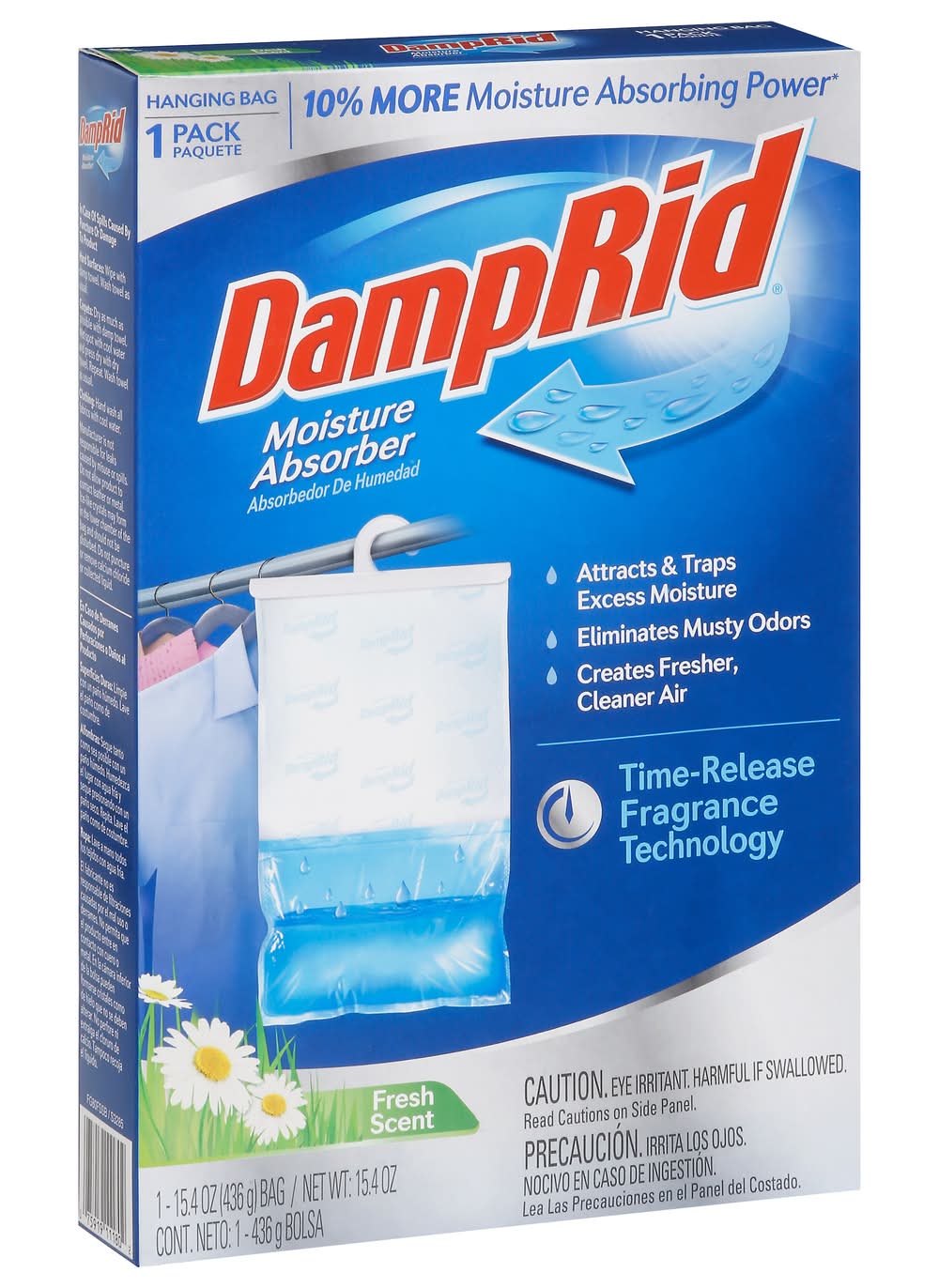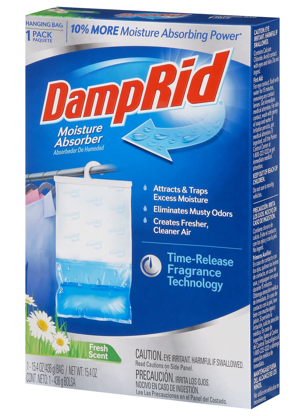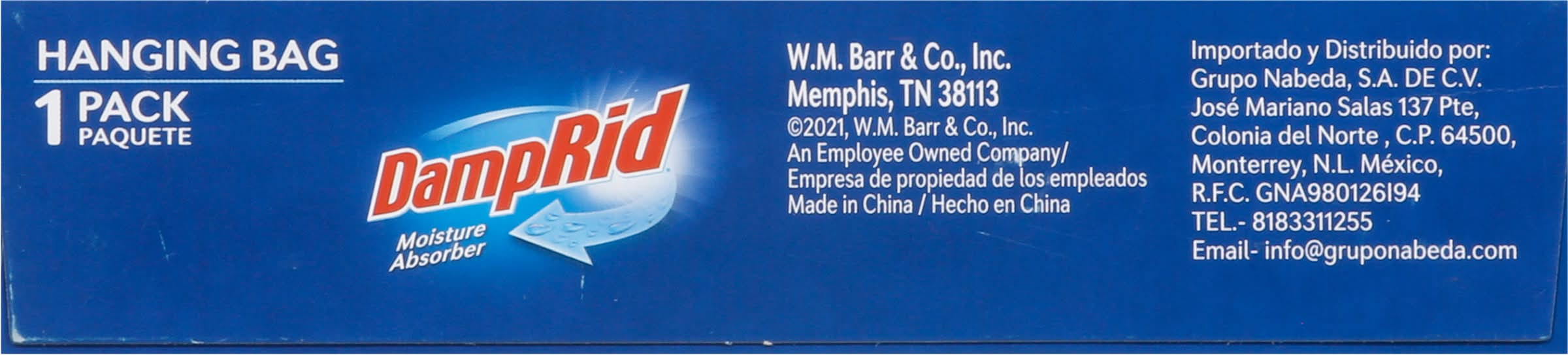 10% more moisture absorbing power (Compared to 14 oz bag (396 g).). Attracts & traps excess moisture. Eliminates musty odors. Creates fresher, cleaner air. Time-release fragrance technology. Lasts up to 60 days (Duration will vary based on temperature and humidity). DampRid Hanging Moisture Absorber eliminates excess moisture that can cause damage to your clothes, leather goods, and other possessions. Now with 10% more moisture absorbing power (Compared to 14 oz bag (396 g)), DampRid lasts even longer. DampRid also eliminates the unpleasant, musty odor caused excess moisture. The time-release fragrance technology releases a pleasant scent continuously over the life of the product. DampRid won't dry the air excessively to damage plants, furniture, or household goods. DampRid hanging moisture absorber can be used in closets, bathrooms, laundry rooms, pantries, and storage areas, where excess moisture and stagnant air are a problem. www.damprid.com. www.barringredients.com. Questions? Comments? 1-888-DampRid (326-7743) in USA only from 8 am to 4:30 pm CT Monday through Friday or online at ww.damprid.com. For more ingredient information: visit: www.barringredients.com or call 1-833-880-5319. Made in China. W.M. Barr & Co., Inc.,
