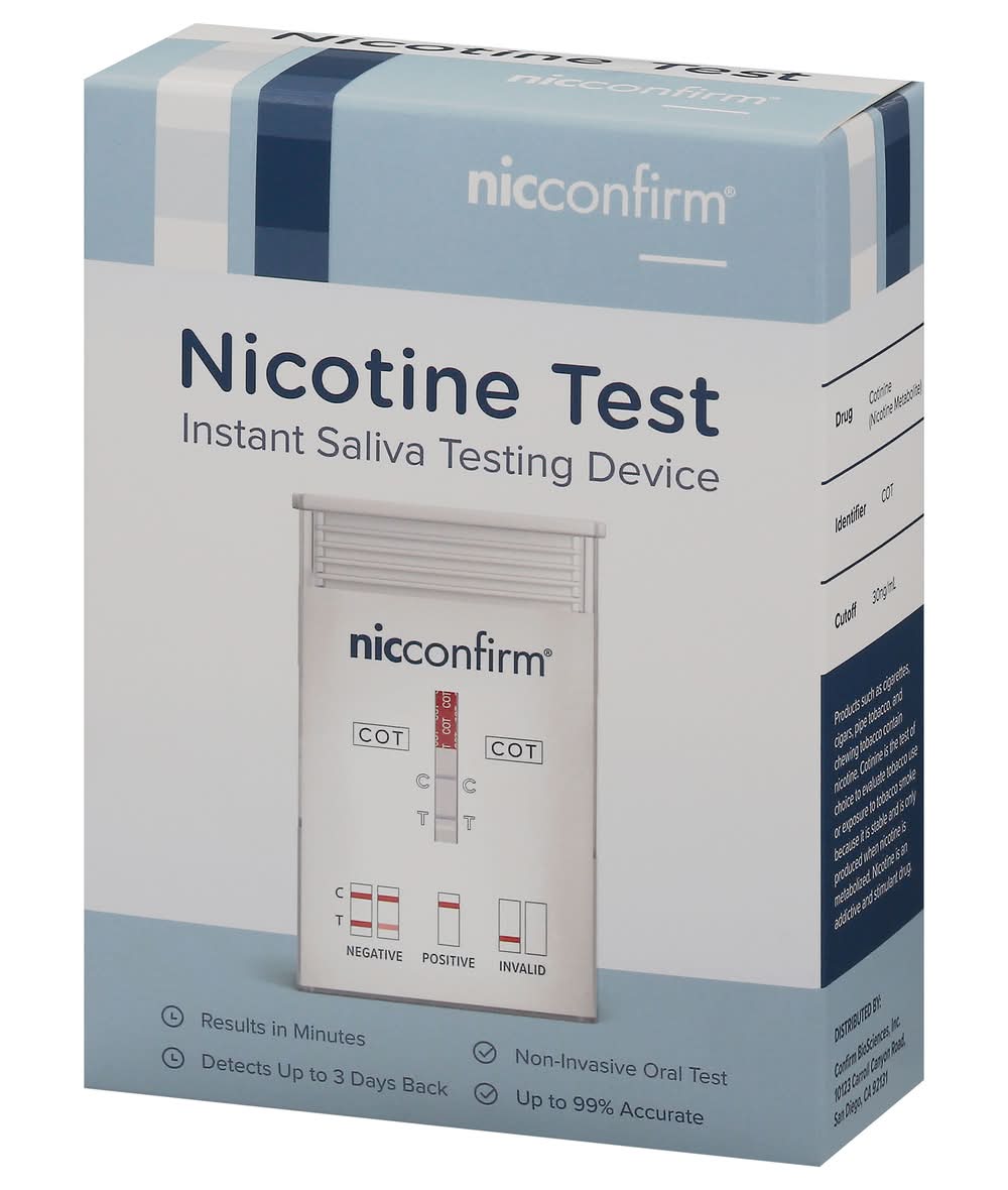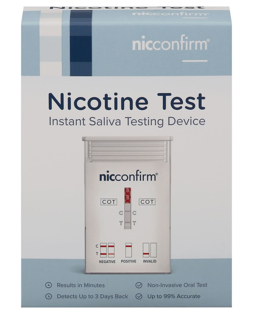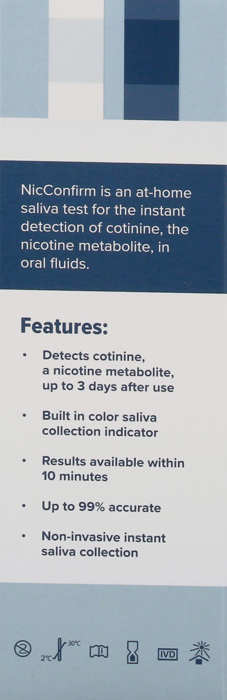Instant saliva testing device. What's included: 1 saliva collector, 1 results device, 1 instructions for use. Results in minutes. Detect up to 3 days back. Non-invasive oral test. Up to 99% accurate. NicConfirm is an at-home saliva test for the instant detection of cotinine, the nicotine metabolite, in oral fluids. Features: Detects cotinine, a nicotine metabolite, up to 3 days after use. Built in color saliva collection indicator. Results available within 10 minutes. Up to 99% accurate. Non-invasive instant saliva collection. Further information included. Products such as cigarettes, cigars, pipe tobacco, and chewing tobacco contain nicotine. Cotinine is the test of choice to evaluate tobacco use or exposure to tobacco smoke because it is stable and is only produced when nicotine is metabolized. Nicotine is an addictive and stimulant drug. Cotinine (Nicotine Metabolite). Cutoff 30ng/ml. confirmbiosciences.com. how2recycle.info. For questions or comments please call 888-212-2209 or visit confirmbiosciences.com. Product of China. Confirm BioSciences, INC.,