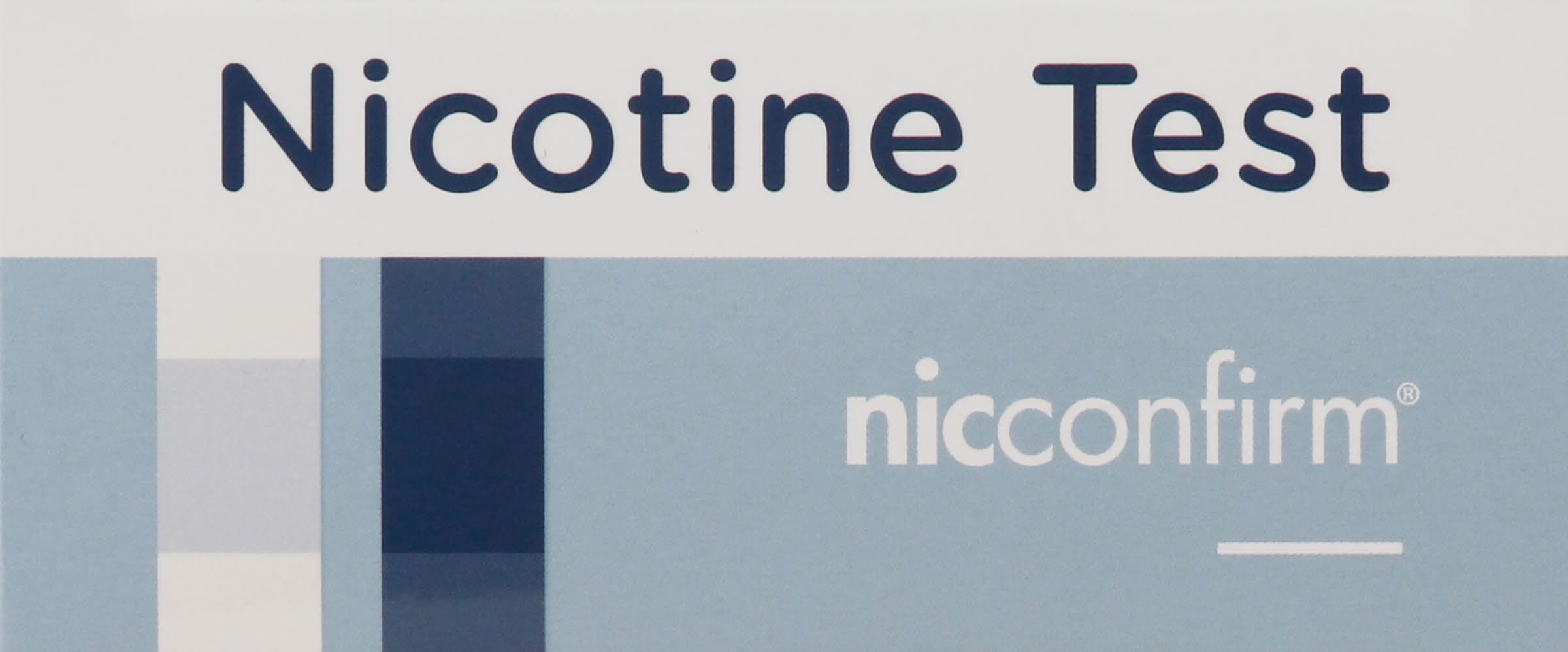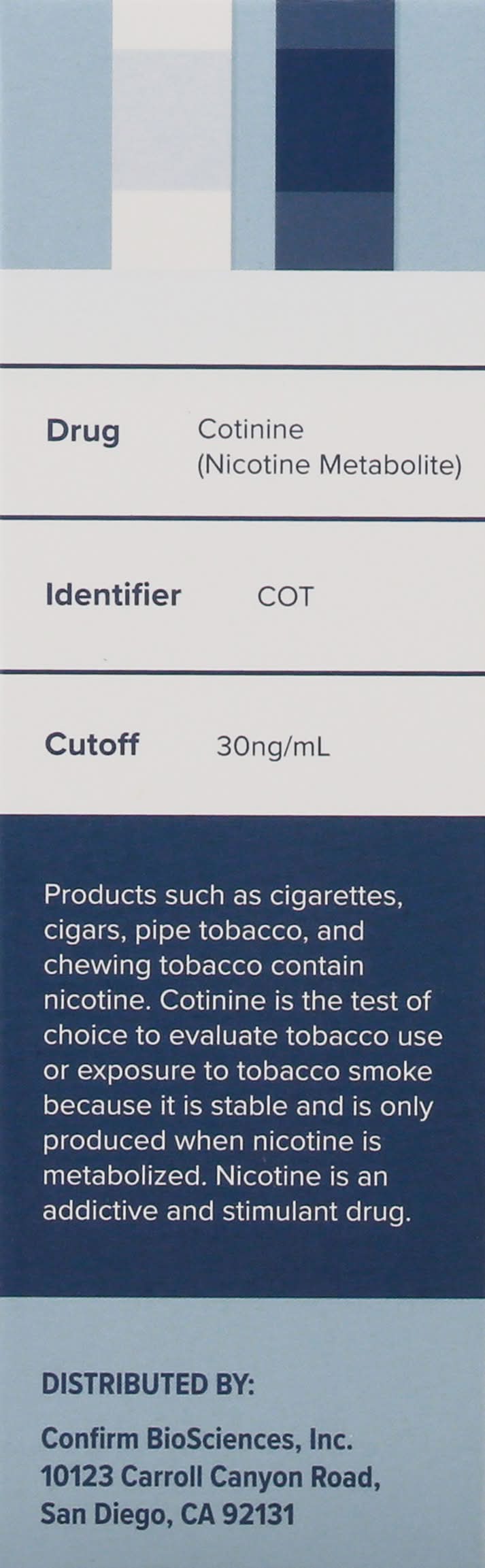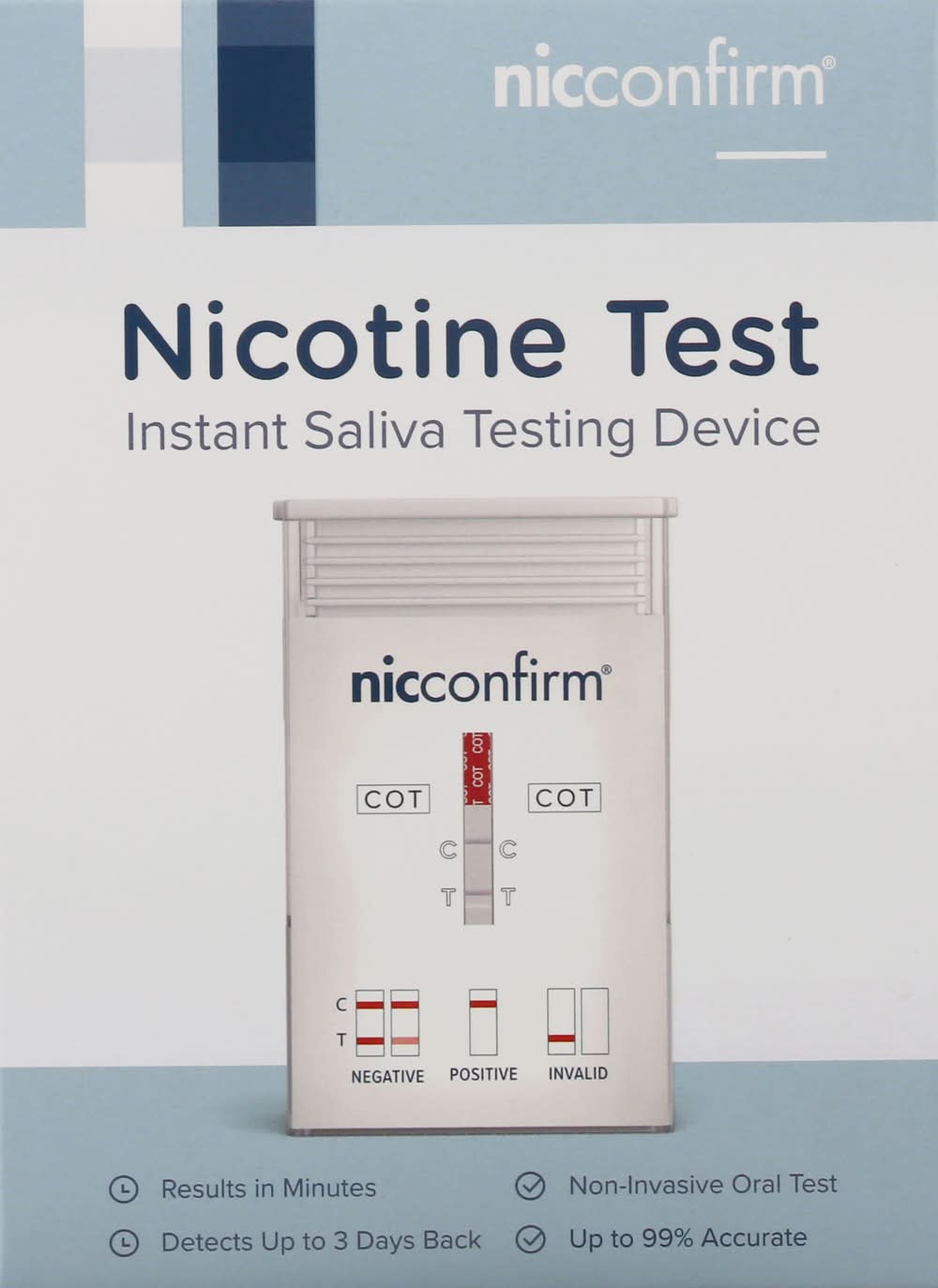 Instant saliva testing device. What's included: 1 saliva collector, 1 results device, 1 instructions for use. Results in minutes. Detect up to 3 days back. Non-invasive oral test. Up to 99% accurate. NicConfirm is an at-home saliva test for the instant detection of cotinine, the nicotine metabolite, in oral fluids. Features: Detects cotinine, a nicotine metabolite, up to 3 days after use. Built in color saliva collection indicator. Results available within 10 minutes. Up to 99% accurate. Non-invasive instant saliva collection. Further information included. Products such as cigarettes, cigars, pipe tobacco, and chewing tobacco contain nicotine. Cotinine is the test of choice to evaluate tobacco use or exposure to tobacco smoke because it is stable and is only produced when nicotine is metabolized. Nicotine is an addictive and stimulant drug. Cotinine (Nicotine Metabolite). Cutoff 30ng/ml. confirmbiosciences.com. how2recycle.info. For questions or comments please call 888-212-2209 or visit confirmbiosciences.com. Product of China. Confirm BioSciences, INC.,