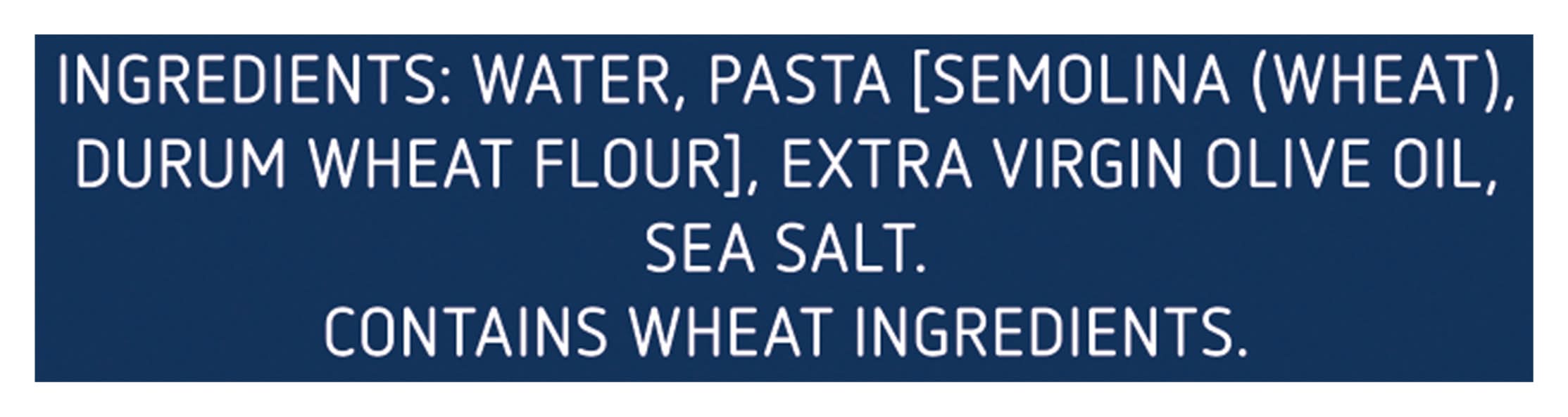Ingredients: Water, Pasta [Semolina (Wheat), Durum Wheat Flour], Extra Virgin Olive Oil, Sea Salt Contains: Wheat