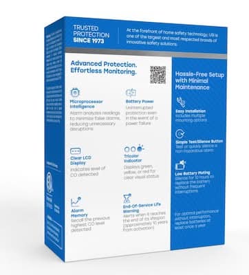 The USI Carbon Monoxide Alarm is your home's silent guardian, providing reliable protection against the invisible threat of CO gas. This advanced alarm features a clear LCD display for easy monitoring of CO levels. A loud, piercing alarm alerts you to dangerous CO concentrations, while a tricolor indicator visually indicates the alarm status. Powered by (2) replaceable AA batteries, the USI Carbon Monoxide Alarm offers uninterrupted protection. Easy to install and maintain, it includes multiple mounting options for flexible placement and a simple test/silence button for convenience. For optimal protection, install the USI Carbon Monoxide Alarm on each level of your home, including bedrooms, living areas, hallways, and kitchens. Backed by a 10-year warranty for added peace of mind, the USI Carbon Monoxide Alarm is a reliable investment in your family's safety. Compliant with UL Std. 2034 4th Edition, this alarm meets the highest industry standards for carbon monoxide detection. Protect your home and loved ones with this essential safety device and enjoy the peace of mind that comes with knowing you're prepared for any situation.