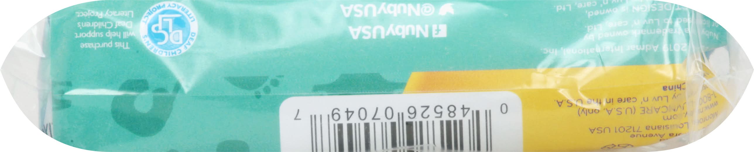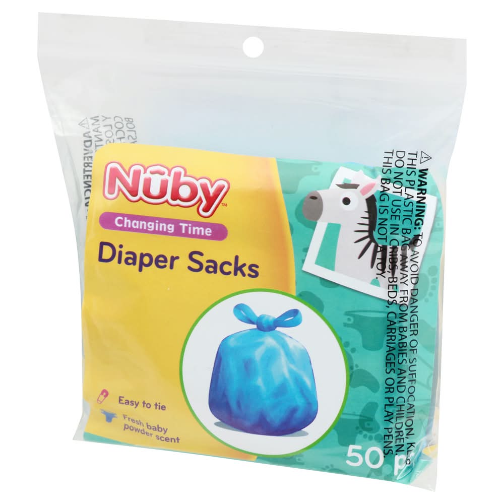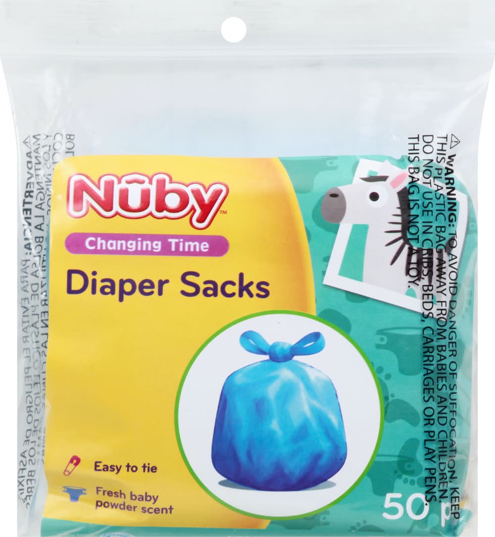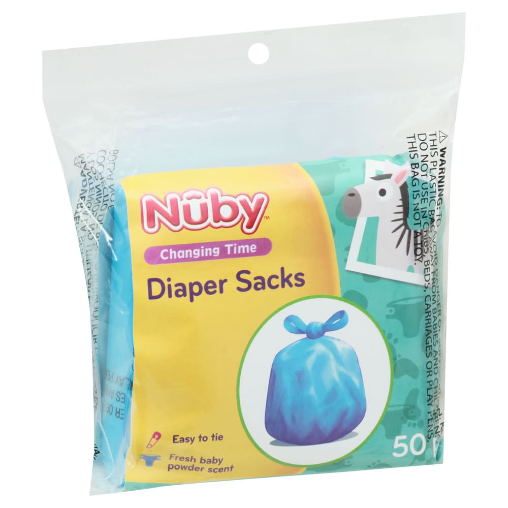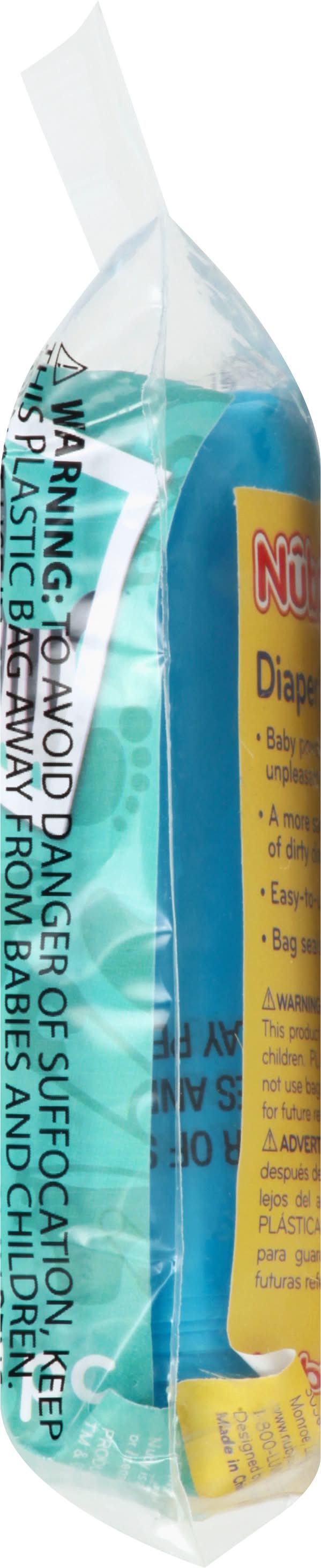 0+ m. Easy to tie. Fresh baby powder scent. Baby powder scent helps mask unpleasant odors. A more sanitary way to dispose of dirty diapers. Easy-to-use tie close tabs. Bag seals in liquids and odors. 3 easy step Meets CPSC safety requirements. www.nuby.com. Twitter: NubyUSA. Facebook: NubyUSA. DLSP: This purchase will help support Deaf Children's Literacy Product. Designed by Luv n' Care in the USA. Made in China. • Nuby, • Packaging: Reusable