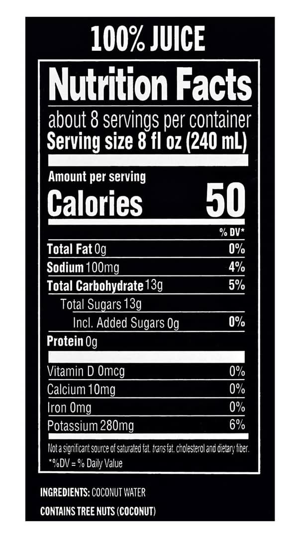 Basically, this is premium coconut water. 100% hydrating, refreshing, never-from concentrate, pulp-free and totally-delicious coconut water. What makes it great: -Nothing but coconut water -No sweeteners -Pulp Free -100% Juice -Not from concentrate Good to know: -Non-GMO -Kosher -Contains tree nuts (coconut) Basically, if you’re still reading this, they’re more-than-extraordinary signature products created just for you, when you want them most. Basically, it’s what you deserve. Pack size: 4