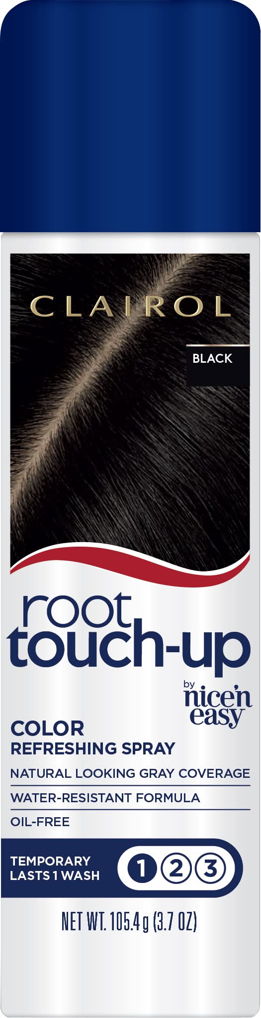 Natural looking gray coverage. Water-resistant formula. Oil-free. Temporary lasts 1 wash. Spray Away Gray in Seconds: Instantly restore color and cover grays. Our blend of pigments are designed to work with your color for natural looking results that last 1 shampoo. Oil-free, peroxide-free and ammonia-free. www.Clairol.com. Questions? Call the expert color consultants at 1-800-Clairol (1-800-252-4765), visit our website at www.Clairol.com, or search for Clairol on Facebook messenger to chat with us! Made in Germany. Coty Inc., New York, NY, 10118