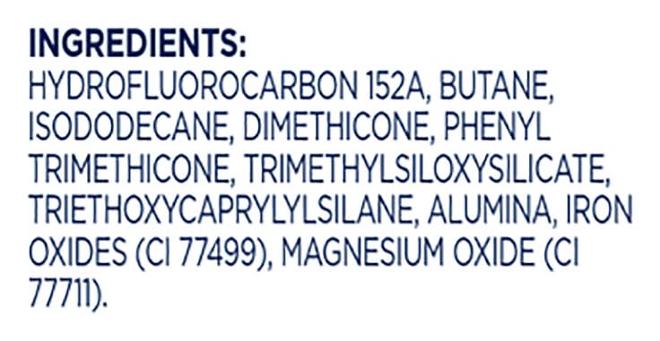 Ingredients: Hydrofluorocarbon 152A, Butane, Isododecane, Dimethicone, Phenyl Trimethicone, Trimethylsiloxysilicate, Triethoxycaprylylsilane, Alumina, Iron Oxides (CI 77499), Magnesium Oxide (CI 7771)