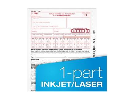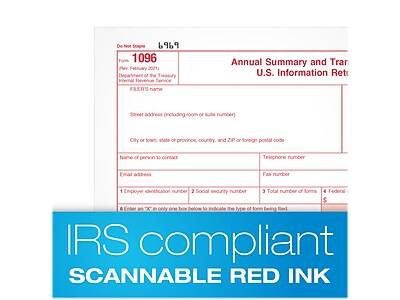 Don't forget, you'll need a 1096 summary report for each type of 1099 form you file. The Adams 1096 10-pack always comes in handy on tax day. - Use form 1096 to submit the totals from information returns 1097, 1098, 1099, 3921, 3922, 5498, and W-2G to the Internal Revenue Service - 1096 summary transmittal form must accompany each type of 1099 mailed to the IRS, due dates will vary by form - Single-part form - Inkjet and laser printer compatible - Pack contains 10 1096 summary forms - Sheet size: 8.5 x 11; detached size: 8 x 11 - Scannable red ink required by the IRS for paper filing - Acid-free paper and heat-resistant ink produce smudge-free, archival-safe records - Meets IRS specifications - (STAX109621)