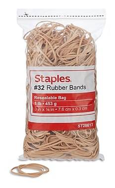 Hold together large folders, statements, documents and other important papers by using this 1-pound bag of Staples #32 rubber bands. Tightly keep items together with this 1-pound bag of #32 rubber bands. These rubber bands come with a reclosable bag, helping keep them safe and secure, while the wide-stretching rubber material lets you wrap them around large objects. These Staples rubber bands come with approximately 900 units per bag and provide consistent performance, helping prevent breaking or tearing. - Economy rubber bands are ideal for regular use - #32 rubber bands are perfect for repeated use or fast application - Each package comes with rubber bands in beige - 900 rubber bands per pack