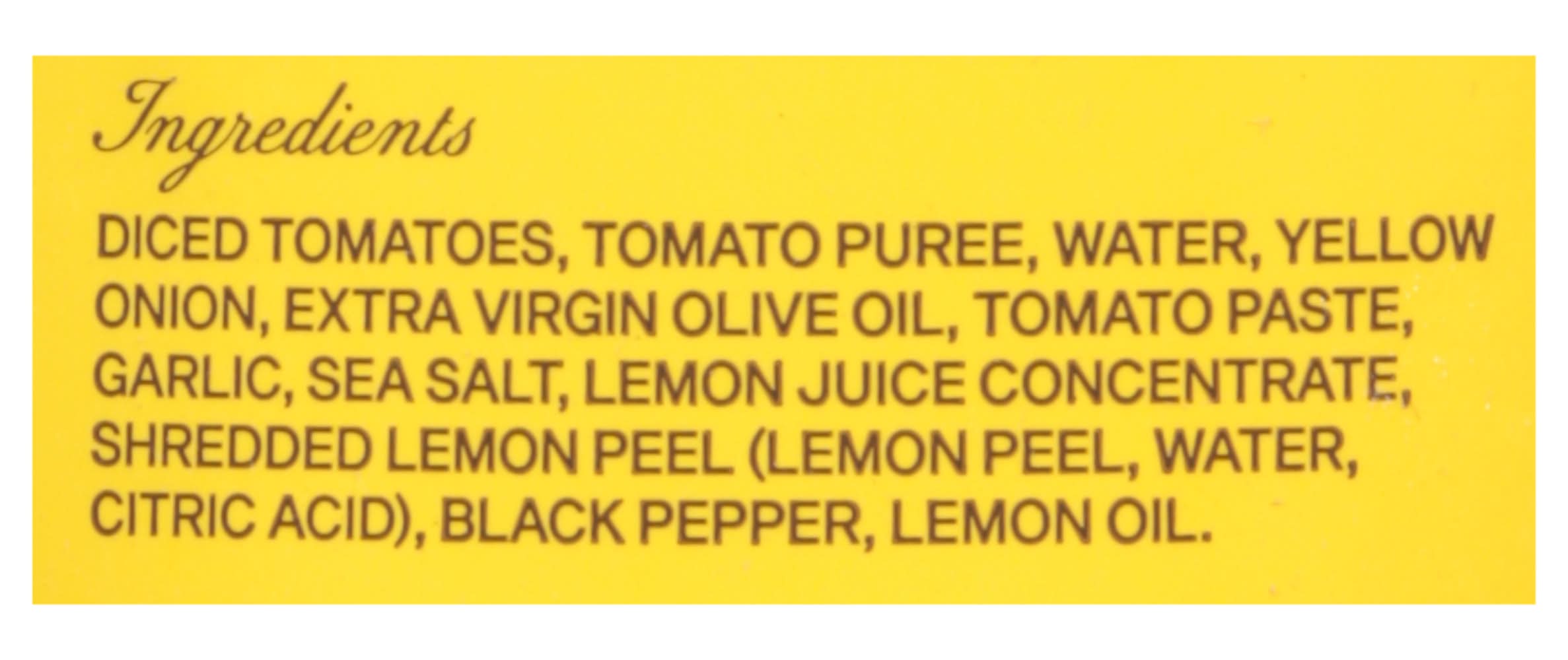 Ingredients: Diced Tomatoes, Tomato Puree, Water, Yellow Onion, Extra Virgin Olive Oil, Tomato Paste, Garlic, Sea Salt, Lemon Juice Concentrate, Shredded Lemon Peel (Lemon Peel, Water, Citric Acid), Black Pepper, Lemon Oil