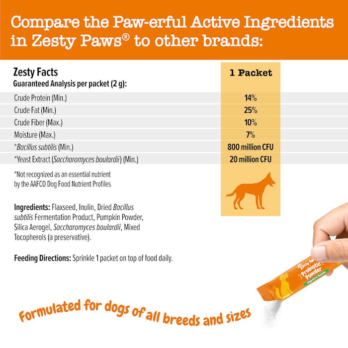 Finding probiotics that truly support your pet's gut isn't always easy! But with Zesty Paws, the days of being upset from not finding the right supplements and toppers for your doggie's stomach are over. Now, there's a tasty alternative to support your pet's tummy. This Probiotic Powder is a mouthwatering topper that support's your dog's digestive system while they chow down. This bowl-lickin' good powder includes live gut bacteria to support your pup's digestion, gut flora, and immune function while they feast with joy! Plus, we know how much pets care about flavors. So, best of all, this powder adds an amazing boost of flavor to your dog's wet or dry foods that'll give them an itch for more. That means pet parents can let out a sigh of daily relief knowing that their canine companion will get the digestive support they want to keep feeling Zesty and happy!