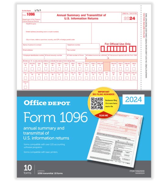 Take the stress out of tax time with the Office Depot 1096 Laser Tax Forms. These tax forms are made of acid-free paper and heat-resistant ink to help prevent yellowing and fading, and they’re compatible with most accounting software programs for your convenience. Use Form 1096 Annual Summary and Transmittal of U.S. Information Returns to transmit paper Forms 1097, 1098, 1099, 3921, 3922, 5498, and W-2G to the IRS. Acid-free paper and heat-resistant ink help prevent yellowing and fading. Scannable for digital record keeping. Compatible with most accounting software programs. Color: White