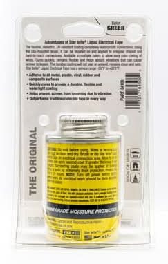 Liquid Electrical Tape (LET) is easy to use, providing an airtight, waterproof, dielectric coating in minutes. The coating will last for the life of the application, yet it can be removed immediately as needed. 1-application will protect terminal connections or splices, as well as guard against vibrations that can loosen connections. Star Brite Liquid Tape is easy to use and reliable. Stir well before using. Wires or terminal to be sealed must be clean Cancer and Reproductive Harm - www.p65warnings.ca.gov Color: Green