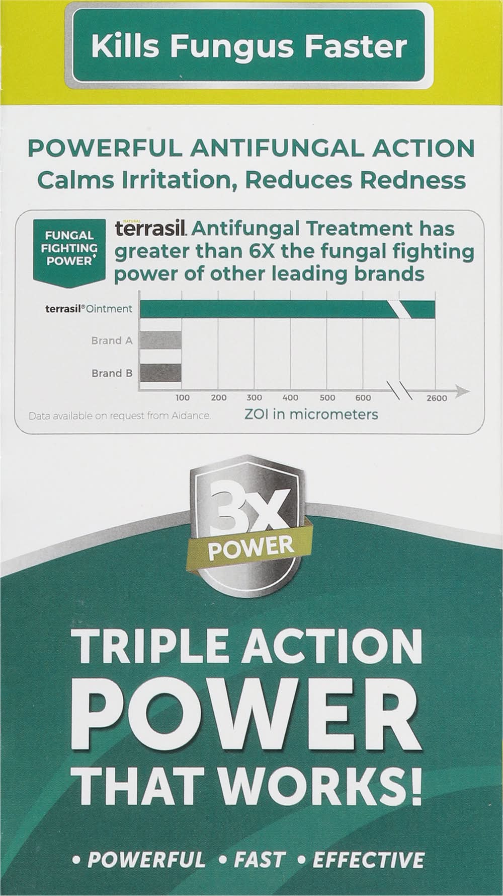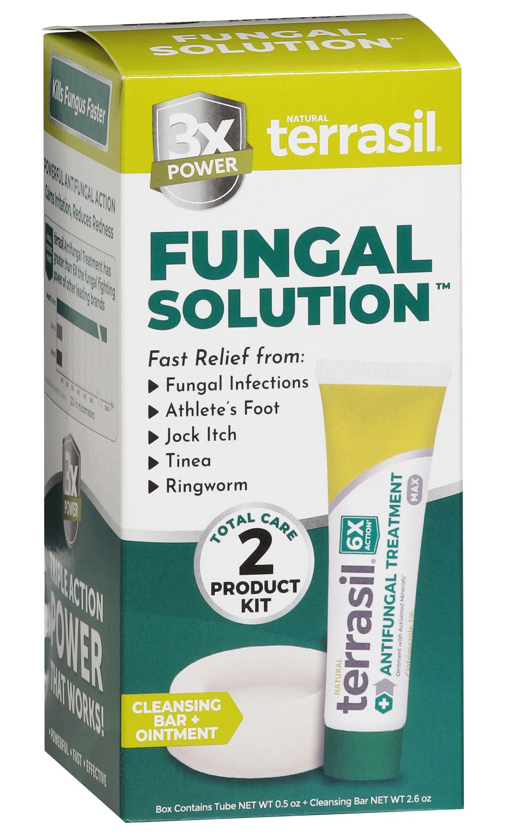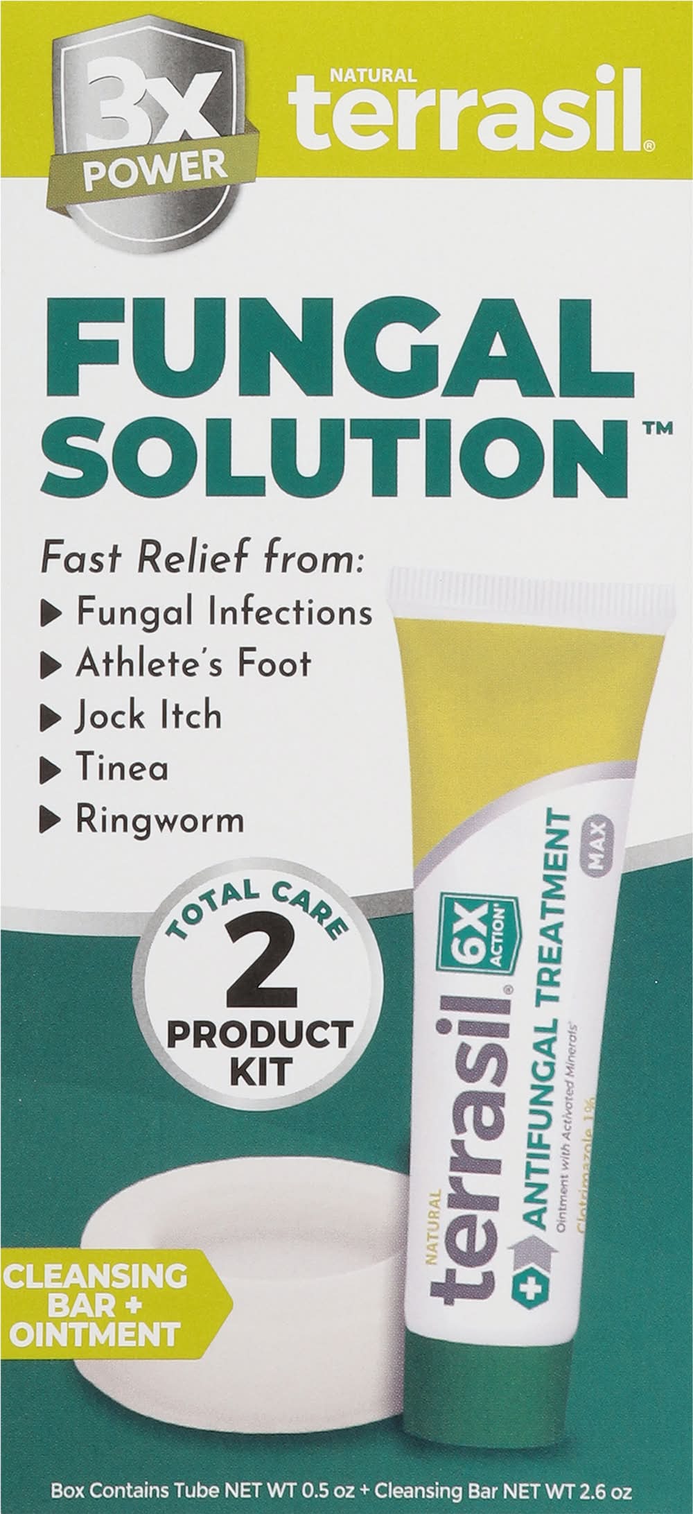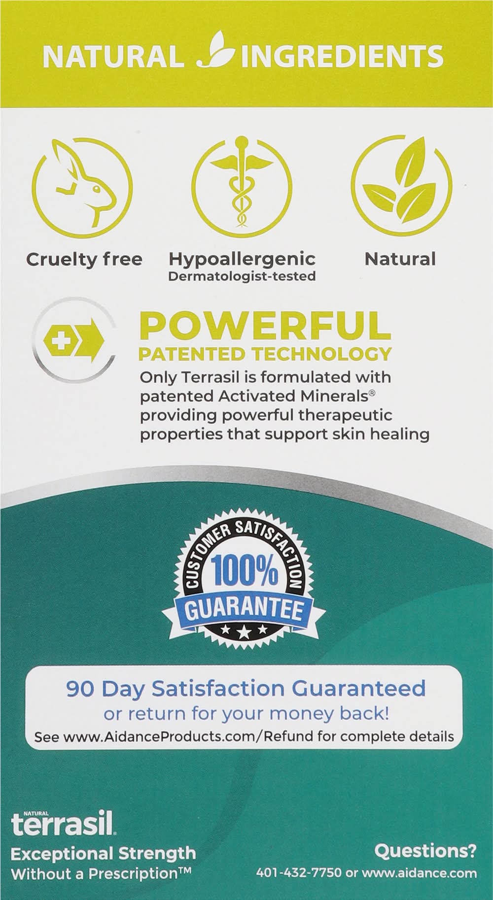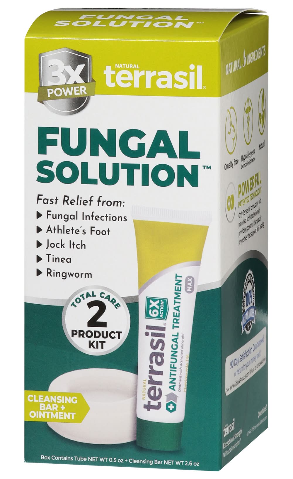 Box contains tube net wt 0.5 oz (14 g) + cleansing bar (75 g). Fast relief from: fungal infections; athlete’s foot; jock itch; tinea; ringworm. Total care 2 product kit. Cleansing bar + ointment. Box contains tube net wt 0.5 oz + cleansing bar net wt 2.6 oz. 3x power triple action power that works! Powerful; fast; effective. Kills fungus faster. Powerful antifungal action. Calms irritation, reduces redness. Fungal Fighter Power: Terrasil Antifungal Treatment has greater than 6x the fungal fighting power of other leading brands. Hypoallergenic dermatologist-tested. Natural. Powerful Patented Technology: Only Terrasil is formulated with patented activated minerals providing powerful therapeutic properties that support skin healing. Exceptional strength without a prescription. Guarantee 100% customer satisfaction. 90 day satisfaction guaranteed or return for your money back! See www.Aidance Products.com/Refund for complete details www.aidance.com. Questions? 401-432-7750 or www.aidance.com. Cruelty free. Aidance Scientific, Inc.,