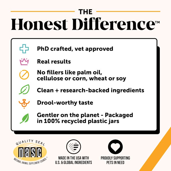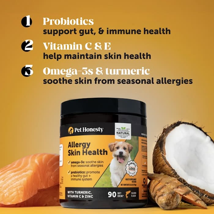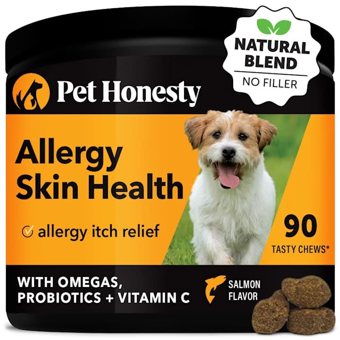 Helps soothe allergy related skin ussues with premium ingredients It's no fun watching your pup deal with from seasonal allergies, skin issues and a dry or dull coat Help support healthy skin, soothe allergy-related skin issues and support healthy digestion for your pup with Pet Honesty's Allergy Skin Health soft chews that contain premium and natural skin health ingredients|Canine specific probiotics in our Allergy Skin Health chews address this root cause of skin issues in dogs by helping to balance their gut to help improve overall health, immunity and nutrient absorption|Allergy Skin Health soft chews are a gentle and safe yet highly beneficial solution for your dog's skin and coat issues Powerful all-natural ingredients like Flaxseed, Vitamin E, Probiotics, Small Fish Oil (low in mercury), Krill, Kelp and DHA Gold are filled with antioxidants, vitamins and healthy Omega-3's and Omega-6's that contribute to skin health.|Pet Honesty Pledge A taste your pet will love & results you can trust. Made with the most effective natural + other premium ingredients Formulated without corn, wheat, or soy. No artificial preservatives, colors, or flavors| All Pet Honesty products are made in the US with US and globally sourced ingredients and are produced in a GMP compliant facility that meets the highest safety standards so you can rest assured you're giving your pet the best quality product possible Pet Honesty is also a NASC member company meaning it’s met the highest quality and compliance standards for pet supplements