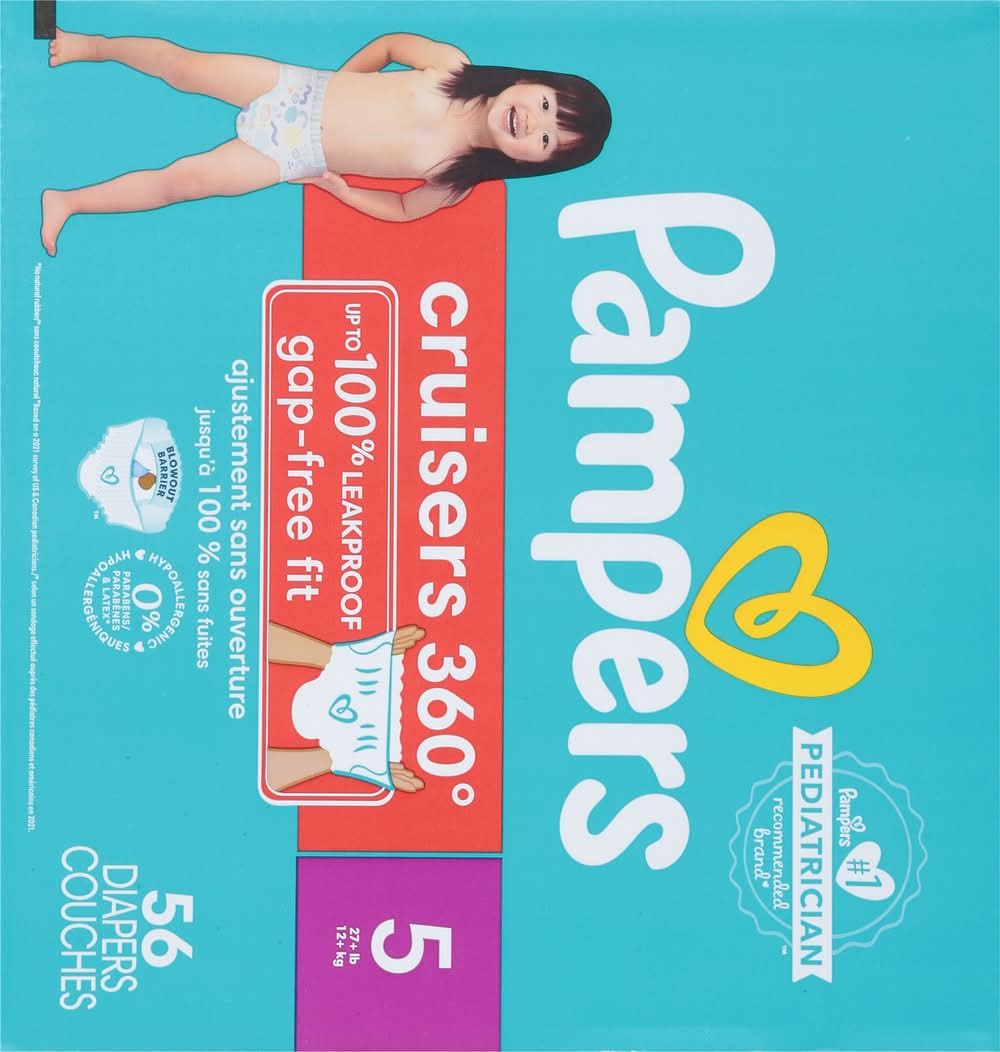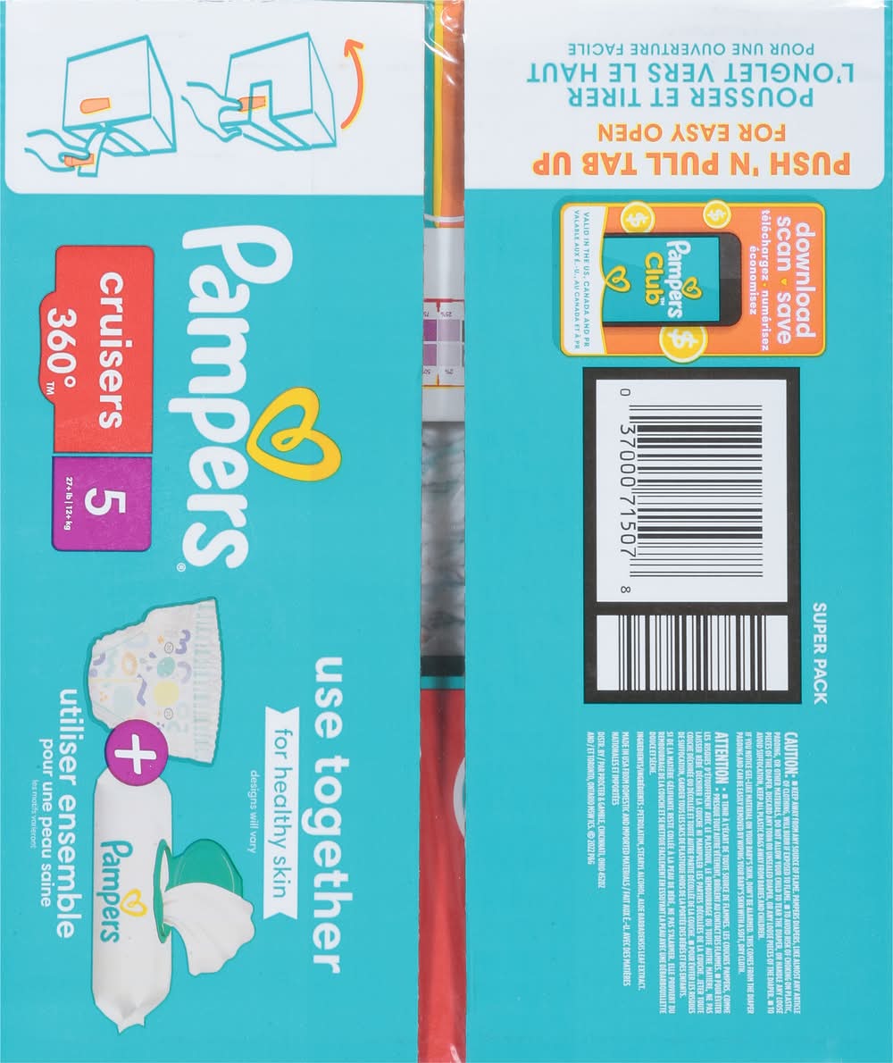 Pampers Cruisers 360 pull-on baby diapers provide our best fit and protection for your active baby at any stage. Unlike ordinary disposable diapers that gap in the back, Pampers Cruisers 360 diapers stretch comfortably around your baby's waist and adapt to their every move for a flexible, Babyproof and gap-free fit that is up to 100% leakproof. Plus, they feature our Dual Leak-Guard Barriers that gently seal around your baby's legs, where leaks happen most. And forget fiddling with ordinary diaper tapes! Pampers Cruisers 360 has a 360-degree stretchy waistband designed to quickly and easily pull up onto your wiggly baby. Easy for you to pull on and take off but difficult to remove for your baby.And when a diaper change is complete, we've made disposal simple. All you need to do is RIP the Easy-Tear Side, ROLL up the diaper, then secure it with the disposal tape that comes attached to the back. Simple as that.Also, to keep your baby's delicate skin healthy, Pampers Cruisers 360 delivers breathable dryness, pulling out wetness and locking it away from skin using our exclusive LockAway Channels. Plus, Cruisers 360 is hypoallergenic and completely free of elemental chlorine bleaching, parabens and latex.*** For trusted protection, trust Pampers to help keep your little one happy and comfy on-the-go, the #1 pediatrician recommended brand.**No Natural rubber • Procter & Gamble, Cincinnati,OH,45202 • Packaging: Reusable