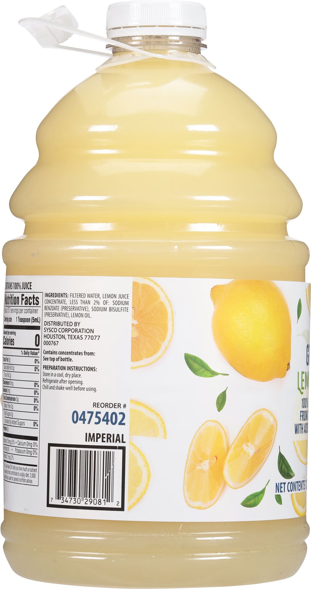 100% lemon juice from concentrate with added ingredients Contains concentrates from: See top of bottle. Sysco Corporation,
