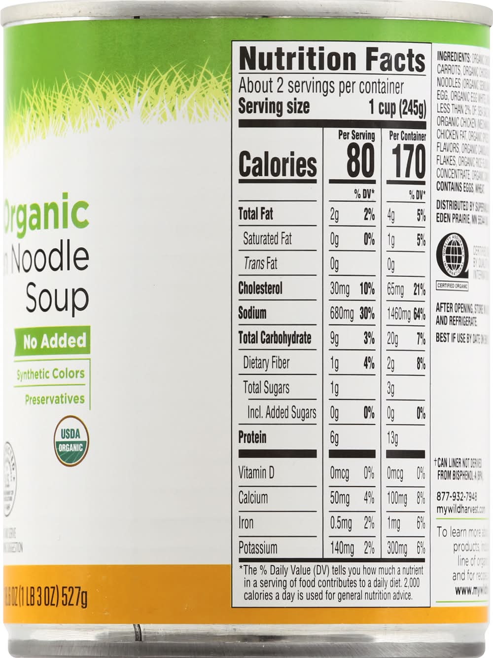 Ingredients: Organic Chicken Stock, Organic Carrots, Organic Chicken Meat, Organic Egg Noodle (Organic Semolina Wheat, Organic Whole Egg, Organic Egg White), Organic Celery, Contains Less than 2% of: Sea Salt, Organic Corn Starch, Salt, Organic Chicken, Mechanically Deboned), Organic Chicken Fat, Organic Spices, Yeast Extract, Natural Flavors, Organic Canola Oil, Organic Parsley Flakes, Organic Rice Flour, Organic Pear Juice Concentrate, Organic Cane Sugar. Contains: Eggs, Wheat