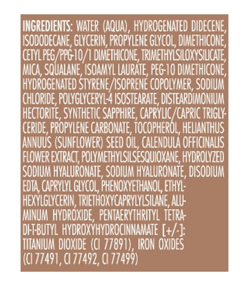 Ingredients: Water (Aqua), Hydrogenated Didecene, Isododecane, Glycerin, Propylene Glycol, Dimethicone, Cetyl PEG/PPG-10/1 Dimethicone, Trimethylsiloxysilicate, Mica, Squalane, Isoamyl Laurate, PEG-10 Dimethicone, Hydrogenated Styrene/Isoprene Copolymer, Sodium Chloride, Polyglyceryl-4 Isostearate, Disteardimonium Hectorite, Synthetic Sapphire, Caprylic/Capric Triglyceride, Propylene Carbonate, Tocopherol, Helianthus Annuus (Sunflower) Seed Oil, Calendula Officinalis Flower Extract, Polymethylsilsesquioxane, Hydrolyzed Sodium Hyaluronate, Sodium Hyaluronate, Disodium EDTA, Caprylyl Glycol, Phenoxyethanol, Ethylhexylglycerin, Triethoxycaprylylsilane, Aluminum Hydroxide, Pentaerythrityl Tetra-Di-T-Butyl Hydroxyhydrocinnamate [+/-]: Titanium Dioxide (CI 77891), Iron Oxides (CI 77491, CI 77492, CI 77499)