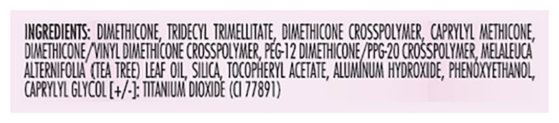 Ingredients: Dimethicone, Tridecyl Trimellitate, Dimethicone Crosspolymer, Caprylyl Methicone, Dimethicone/Vinyl Dimethicone Crosspolymer, PEG-12 Dimethicone/PPG-20 Crosspolymer, Melaleuca Alternifolia (Tea Tree) Leaf Oil, Silica, Tocopheryl Acetate, Aluminium Hydroxide, Phenoxyethanol, Caprylyl Glycol [+/-]: Titanium Dioxide (CI 77891)