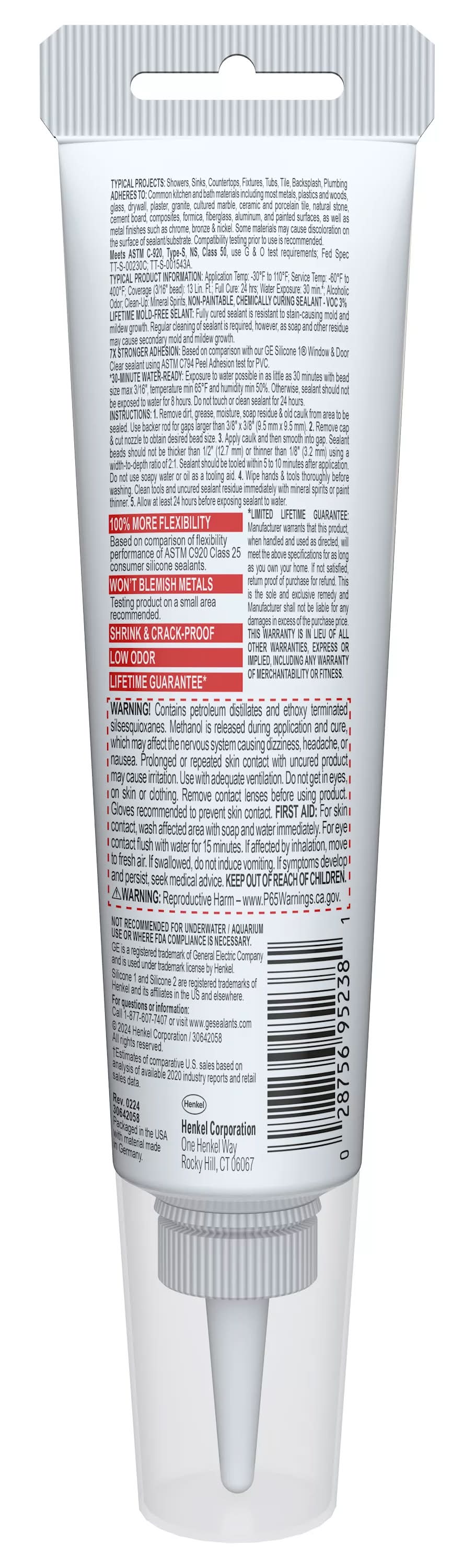 100% Waterproof: This 100% silicone formula offers ultimate protection from water damage and is water-ready in 30 minutes. Lifetime Mold-Free Product Protection: Cured sealant is resistant to stain-causing mold and mildew growth. Permanently Flexible with Strong Adhesion: Sealant offers 100% more flexibility than Class 25 sealants and 7X stronger adhesion than our Silicone 1 sealant. Ideal for Indoor Use: Low-odor sealant won’t discolour most high-end metal finishes such as chrome, bronze, and nickel. Shrink- and Crack-Proof: Withstands extreme expansion and contraction associated with temperature fluctuations. Compatible with Most Materials: Adheres to most metals and woods; aluminum, composites, brick, stone, stucco, masonry, cement board, glass, drywall, ceramic and porcelain tile; and more. Use Location: Interior For CA Residents Only: WARNING: This product can expose you to chemicals including Lead which are known to the State of California to cause cancer and birth defects or other reproductive harm. For more information go to www.P65Warnings.ca.gov. Color: Clear