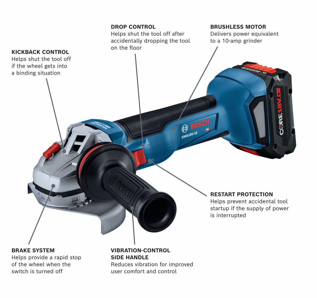 Bosch Brushless Angle Grinder Kit With Core18v 8 Ah High Power Battery, 4-1/2 – 5 In (4.4 lbs)