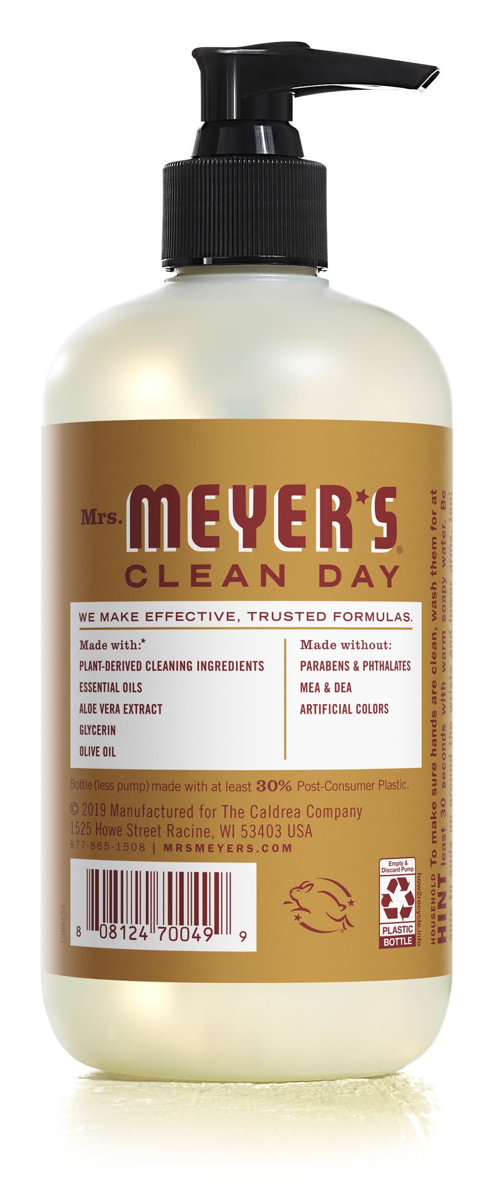 Hard-working Apple Cider scented soap for busy hands. Liquid hand soap made with essential oils, aloe vera, olive oil, and other thoughtfully chosen ingredients. Orchard-fresh Apple Cider hand soap has a sweet and crisp scent, with a little touch of spice. Hand Soap made without parabens, phthalates or artificial colors. Mrs Meyer's products are made with cruelty-free formulas and are Leaping Bunny certified. Moisturizing hand soap that softens busy and hardworking hands.