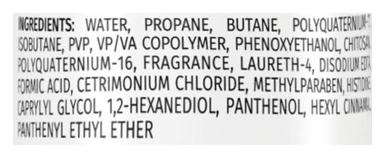 Ingredients: Water, Propane, Butane, Polyquaternium-4, Isobutane, PVP, VP/VA Copolymer, Phenoxyethanol, Chitosan Polyquaternium-16, Fragrance, Laureth-4, Disodium EDTA, Formic Acid, Cetrimonium Chloride, Methylparaben, Histidine, Caprylyl Glycol, 2-Hexanedioil, Panthenol, Hexyl Cinnamal Panthenyl Ethyl Ether