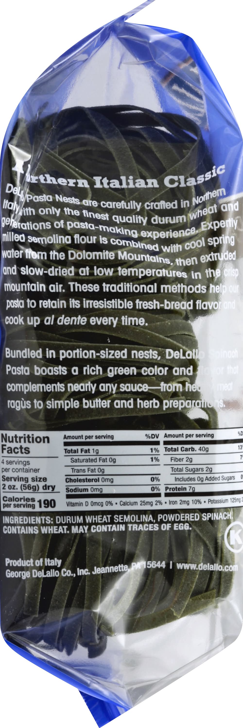 Made with durum wheat semolina. Per 2 oz Serving: 190 calories; 0 g sat fat (1% DV); 0 g sodium (0% DV); 2 g sugars. Cook 8 min. Since 1950. A Northern Italian Classic: DeLallo Pasta Nests are carefully crafted in Northern Italy with only the finest quality durum wheat and generations of pasta-making experience. Expertly milled semolina flour is combined with cool spring water from the Dolomite Mountains, then extruded and slow-dried at low temperatures in the crisp mountain air. These traditional methods help our pasta to retain its irresistible fresh-bread flavor and cook up al dente every time. Bundled in portion-sized nests, DeLallo Pasta complements nearly any sauce - from hearty meat ragus to simply butter and herb preparations. Visit www.delallo.com for more tips and recipe ideas. Product of Italy. Made in Italy. GEORGE DELALLO,