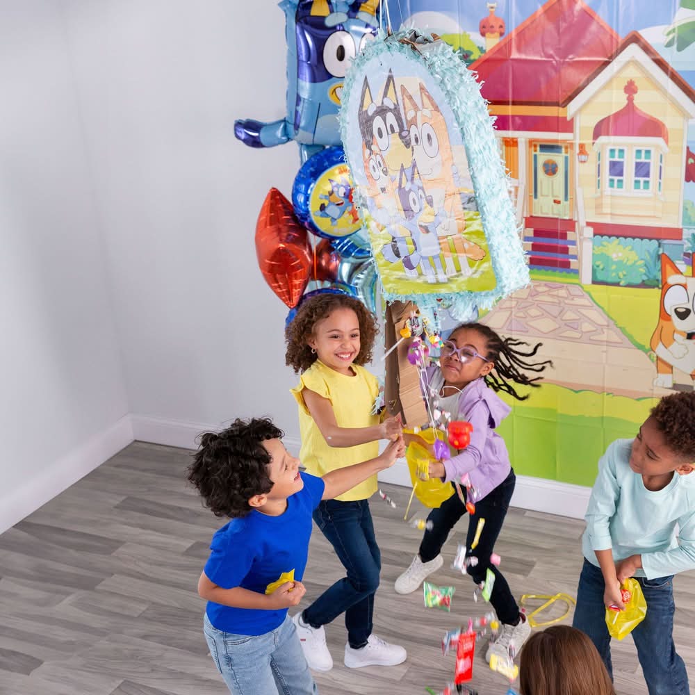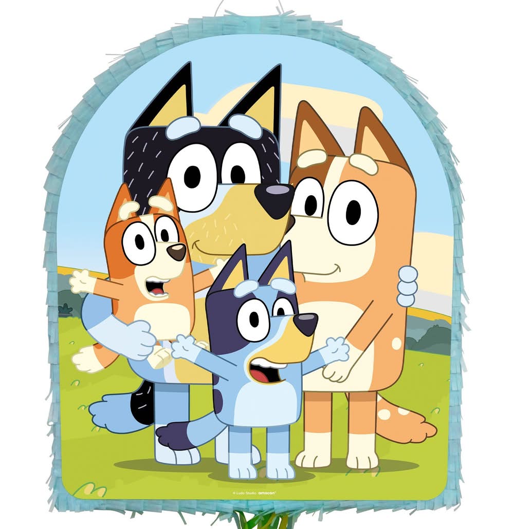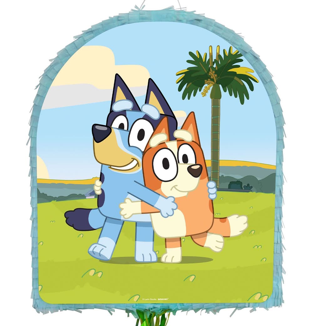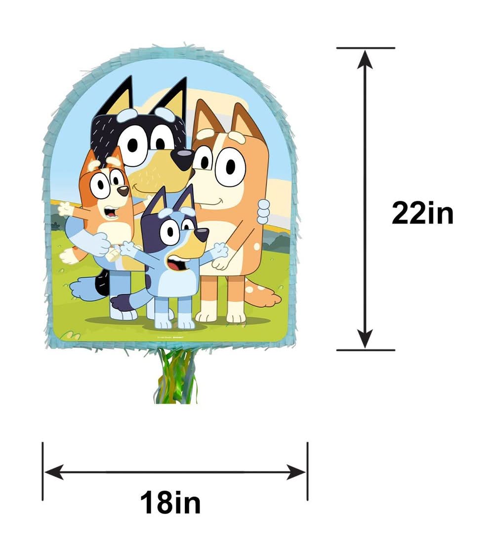 Add festive fun to their birthday celebration with this pinata! The pull-string pinata is light blue and features Bluey and Bingo on one side and the whole family on the other. Fill the pinata with party favors and candy, hang it by the attached strong plastic loop, and let guests take turns pulling the strings on the bottom until the trap door releases its contents. Or, guests can open it the traditional way with a bat and blindfold (sold separately). Pull String Bluey Cardstock Tissue Paper Pinata product. 17.5in wide x 3in deep x 21.75in tall Design on both sides. Holds up to 2lb of pinata filler Pinata filler, bat, and blindfold sold separately Cardstock and tissue paper.