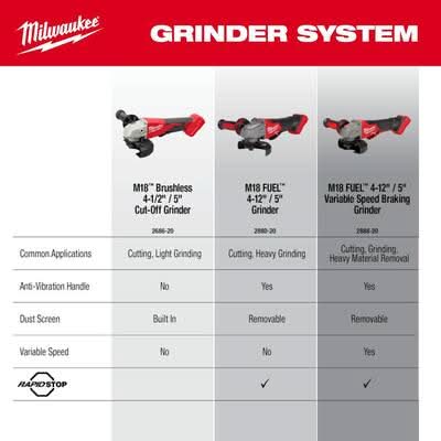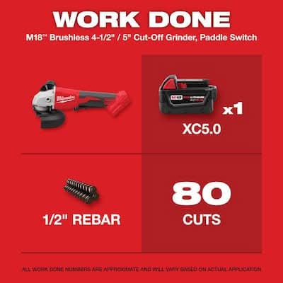 The MILWAUKEE® M18™ Brushless 4-1/2” / 5” Cut-Off Grinder delivers power and runtime while maintaining a compact size. Milwaukee built and optimized the 11,000-rpm brushless motor specifically for cutting and surfacing applications. The Brushless Grinder, paired with built-in REDLINK™ power tool technology and REDLITHIUM™ batteries, efficiently delivers power and provides longer battery life, resulting in up to 80 cuts in ½” rebar. With the XC5.0 battery attached, the Brushless Grinder's body weighs only 4.6 lbs and measures 12.25" in length. The Brushless Grinder includes an electronic clutch for kickback protection and overload protection to maximize motor life. The 5/8”-11 spindle and tool-free guard adjustments ensure faster adjustments and less downtime while fully compatible with the most common grinder accessories in the market. The compact and lightweight build allows for excellent control and comfort. The all-metal gear case ensures that the Brushless Grinder is built to last and gets the job done every time.
