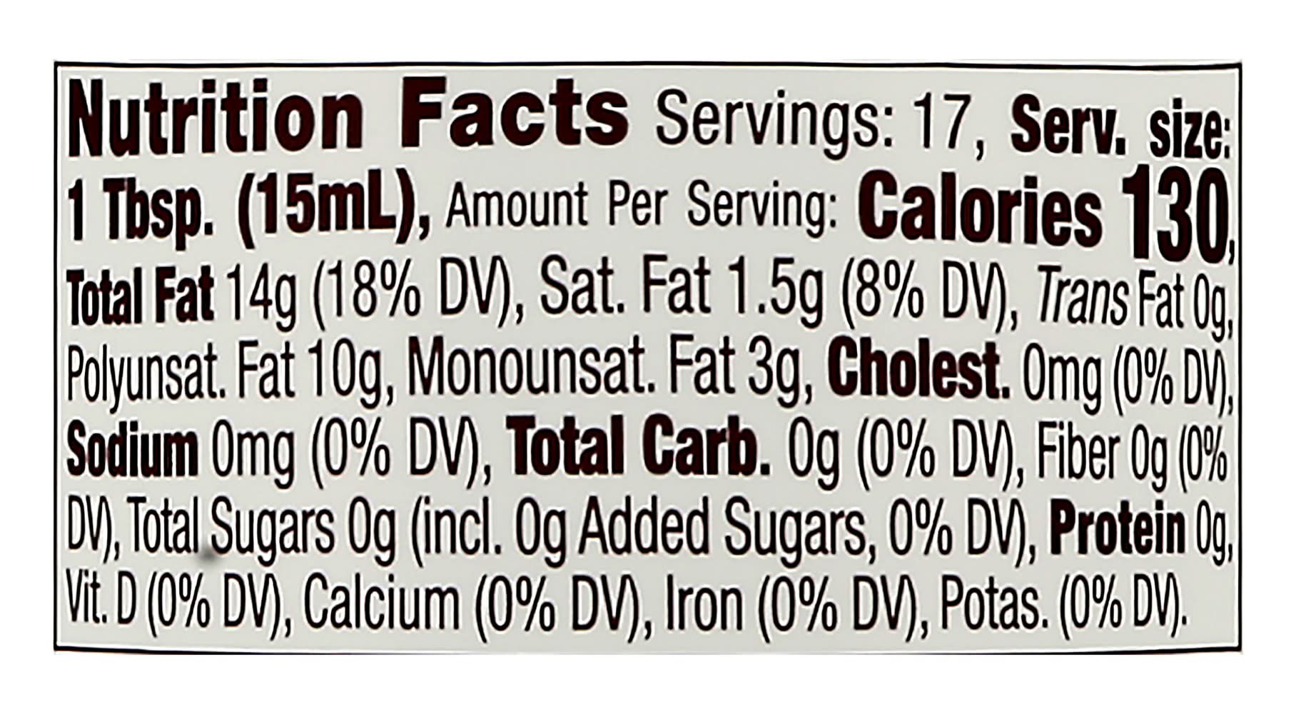 Organic Virgin Flaxseed Oil. Contains: 'Free From Gluten', 'May Contain Tree Nuts', 'May Contain Peanuts', 'May Contain Sesame', 'May Contain Soybeans'